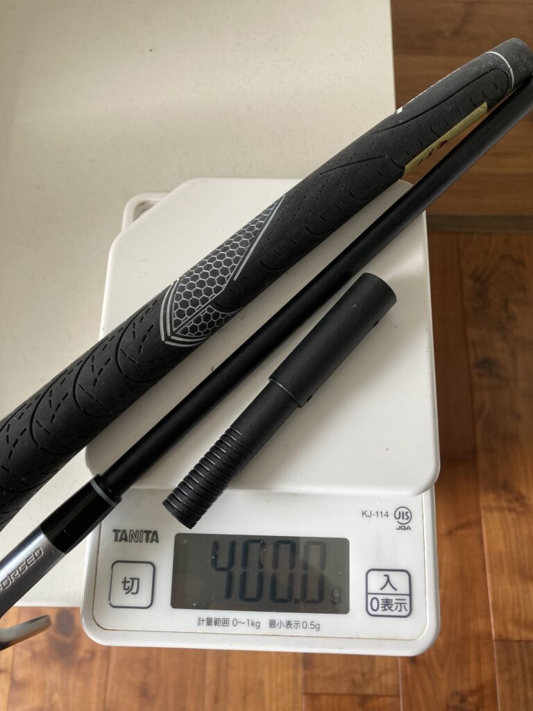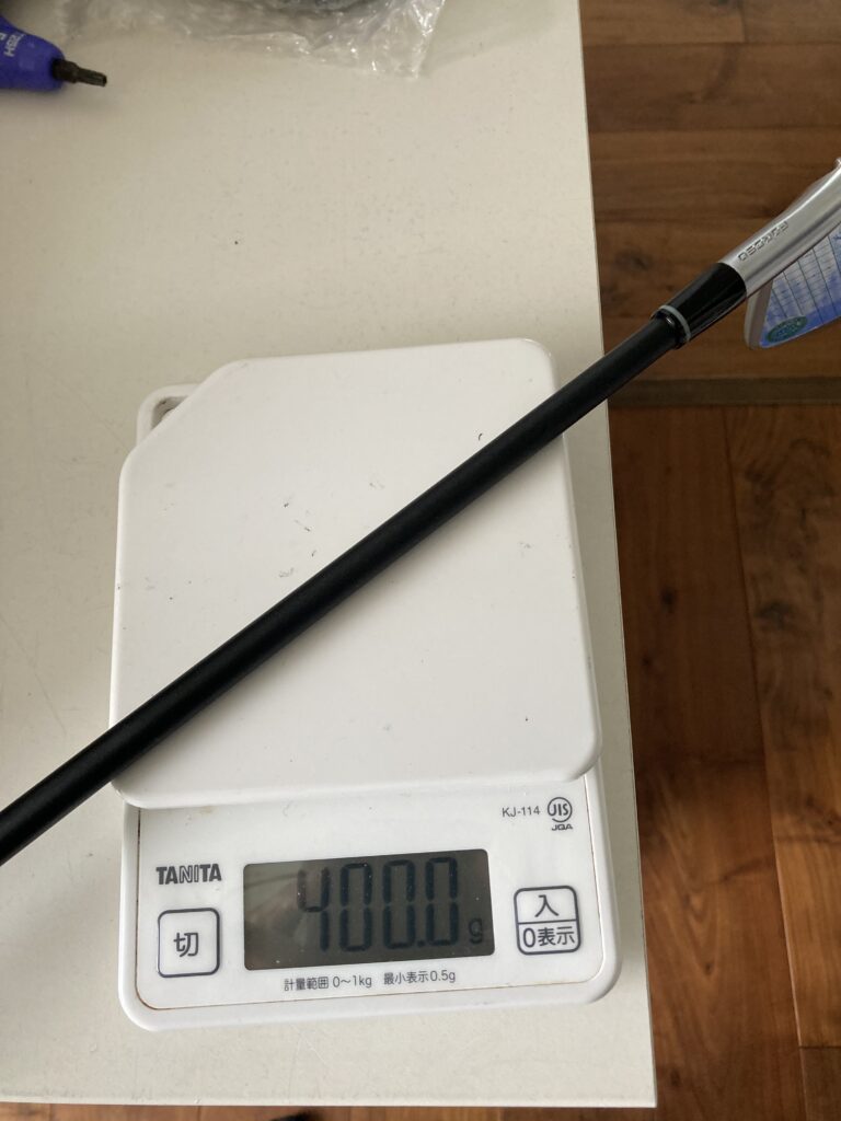 エクステンダーを1インチカットしましたが、両面テープの重さもあって丁度400gに仕上がりました。7番アイアンが397gなので本来なら5g程度軽くしたかったのですが、許容範囲ということで乾いたら仕出してきます。