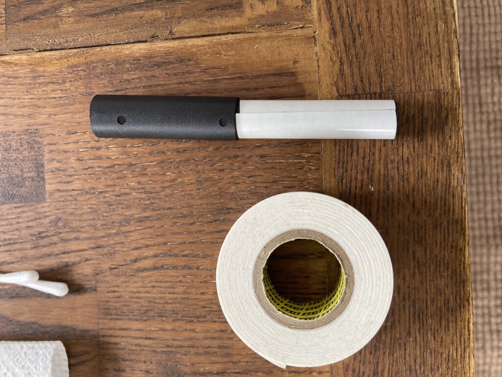 グリップ様に両面テープを貼ってから、パーツクリーナーを吹き掛け、グリップを取り付けます。