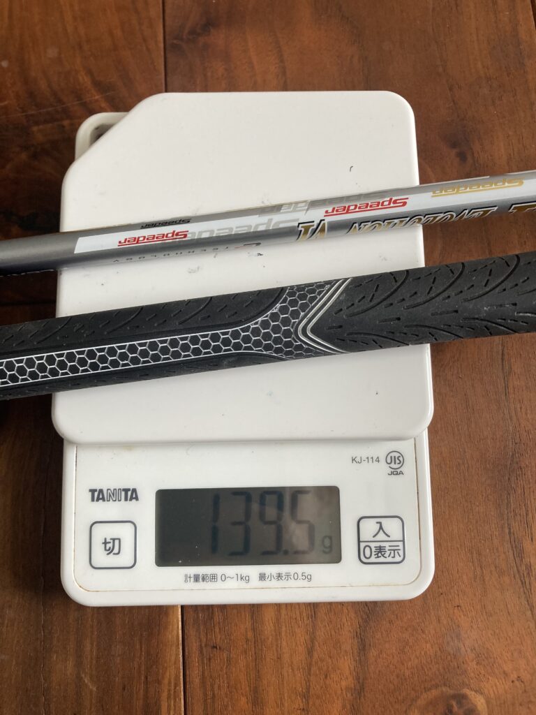 カット前のミッドサイズのグリップとスリーブが付いた状態では139.5gありました。ミッドサイズグリップの重量は66.5g位もあります。スタンダードグリップの50gに比べて16-18g(個体差)重くなりますのでカウンターバランス効果が出て軽く振れます。