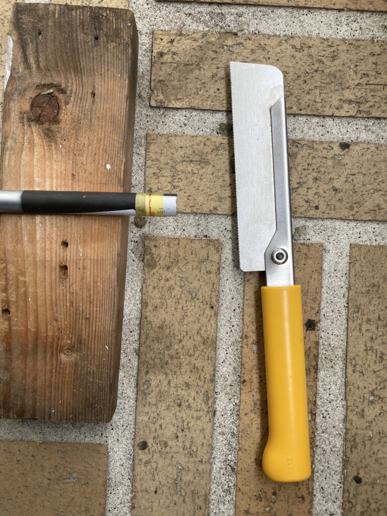 OLFAのクラフトノコ(細めノコ)で切っていきます。カーボンなのでゆっくり着れば何も問題ありません。