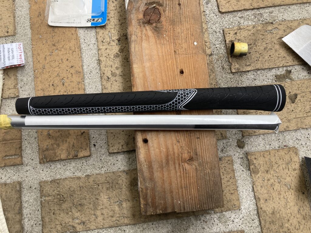 新しいミッドサイズグリップを仮当てし、シャフトに少し短く両面テープを貼りました。技がないので螺旋巻きにはしません。テープの保護シートを剥がし、パーツクリーナーをテープの溶剤面とグリップの中にスプレーしミッドサイズグリップを向きを調整して差し込みます。