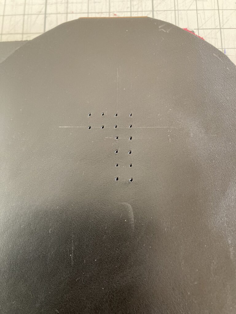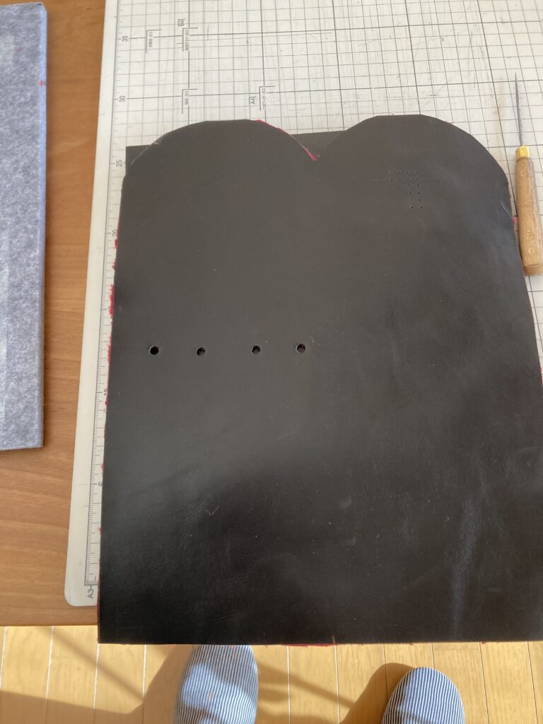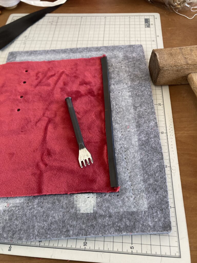 入り口部分の革を少しを折り返して糸で縫うための穴あけをします。