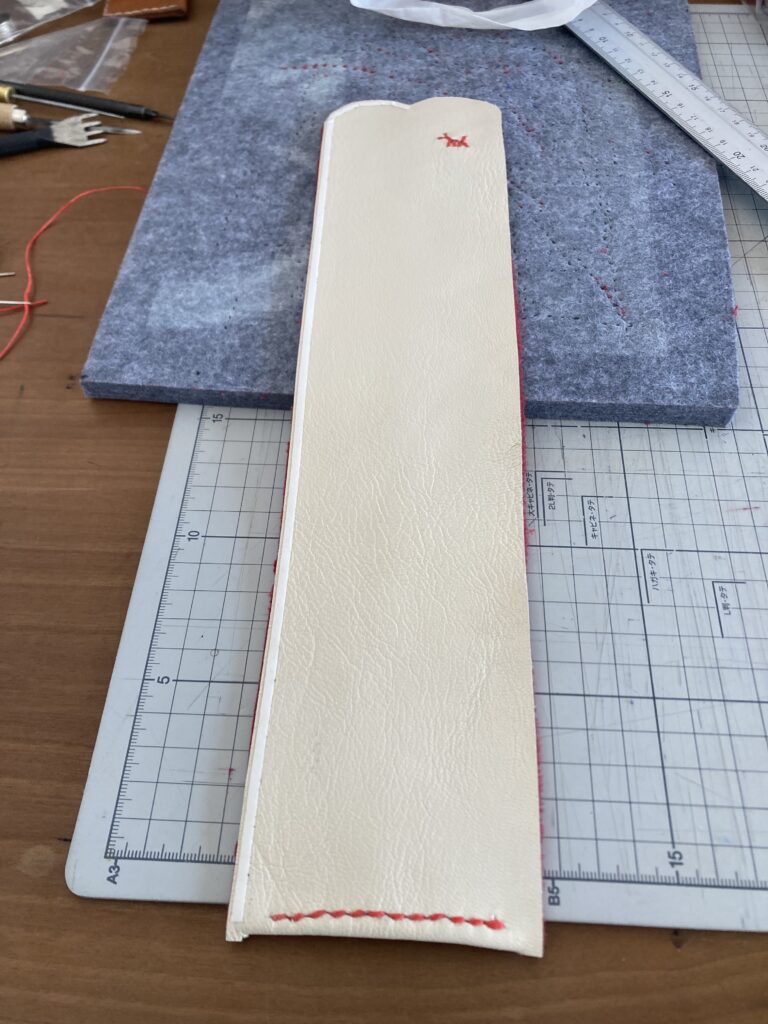 こちらも先行作業でマーク(犬)を刺繍し、入り口部分だけ赤い糸で縫いました。犬のマークは尊敬する革職人のアンリ・クイール氏が時々作品につけています。可愛らしいので真似させていただ来ました。もし、自分の製品を作って販売する時には何かオリジナルなマークを考えないといけませんね。アライメントスティックカバーはヘッドカバーと作る過程は同じですが、全体が細く入り口が狭いため裏返しで縫った後ではひっくり返せないかもしれません。一回作って試そうか、表側で合わせて縫い目を外に出そうか、考えます。これも残り作業は明日とします。