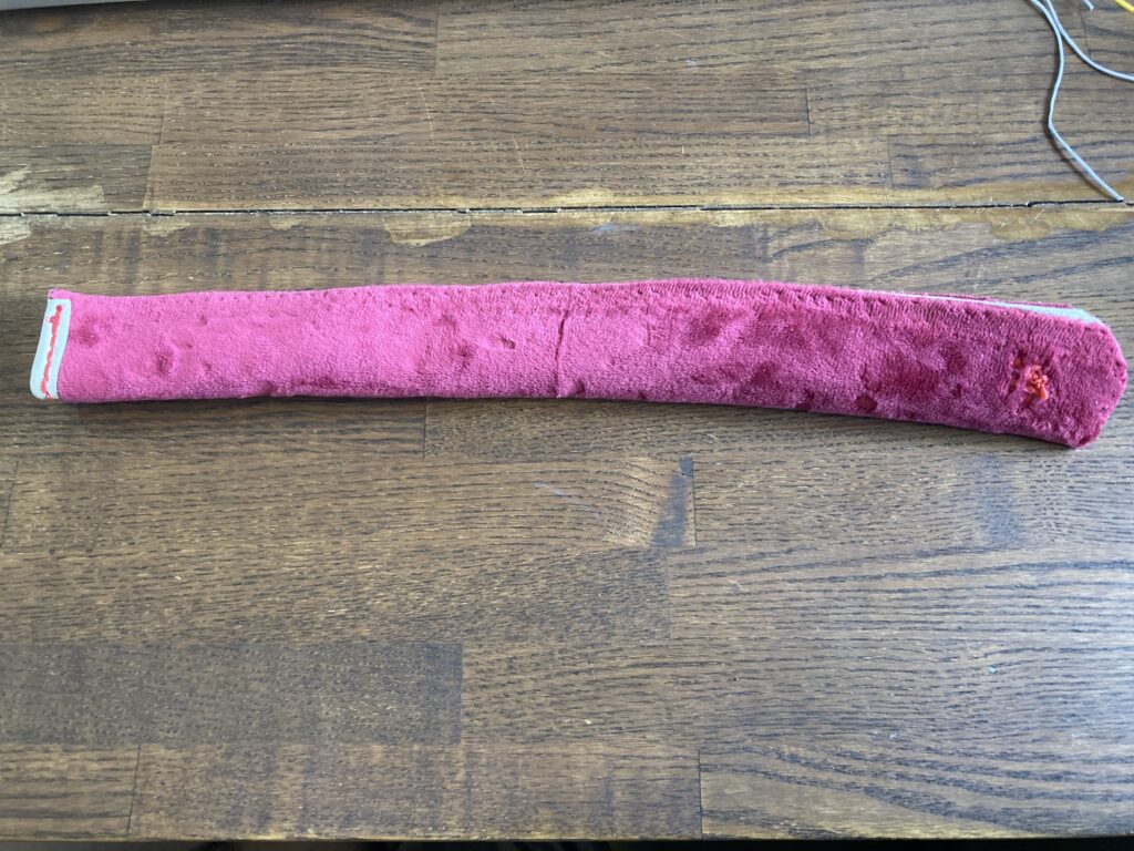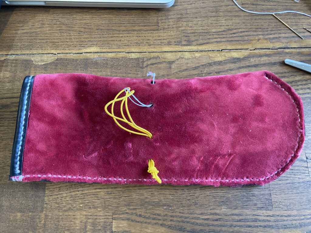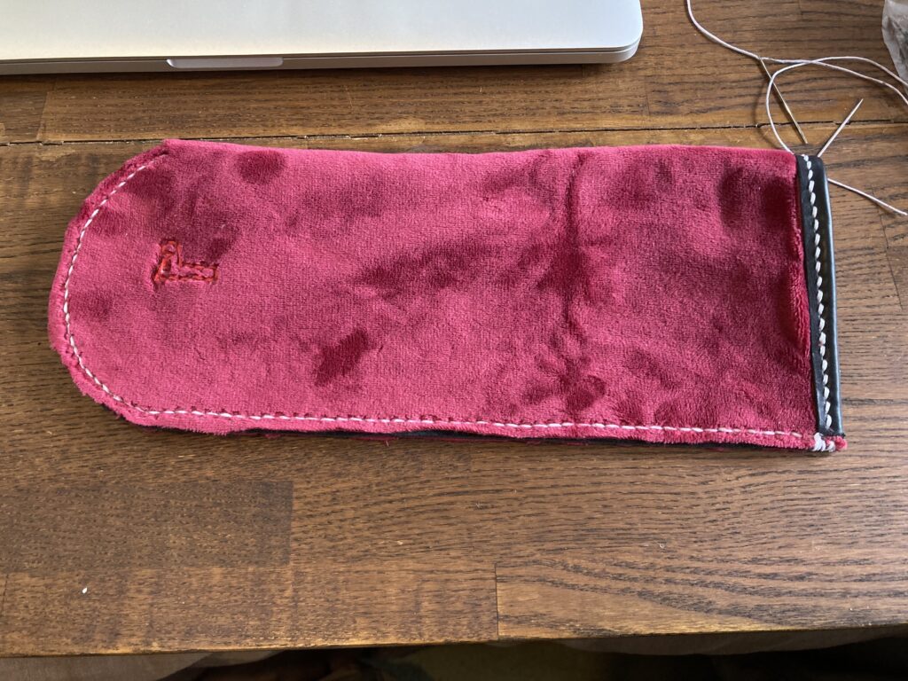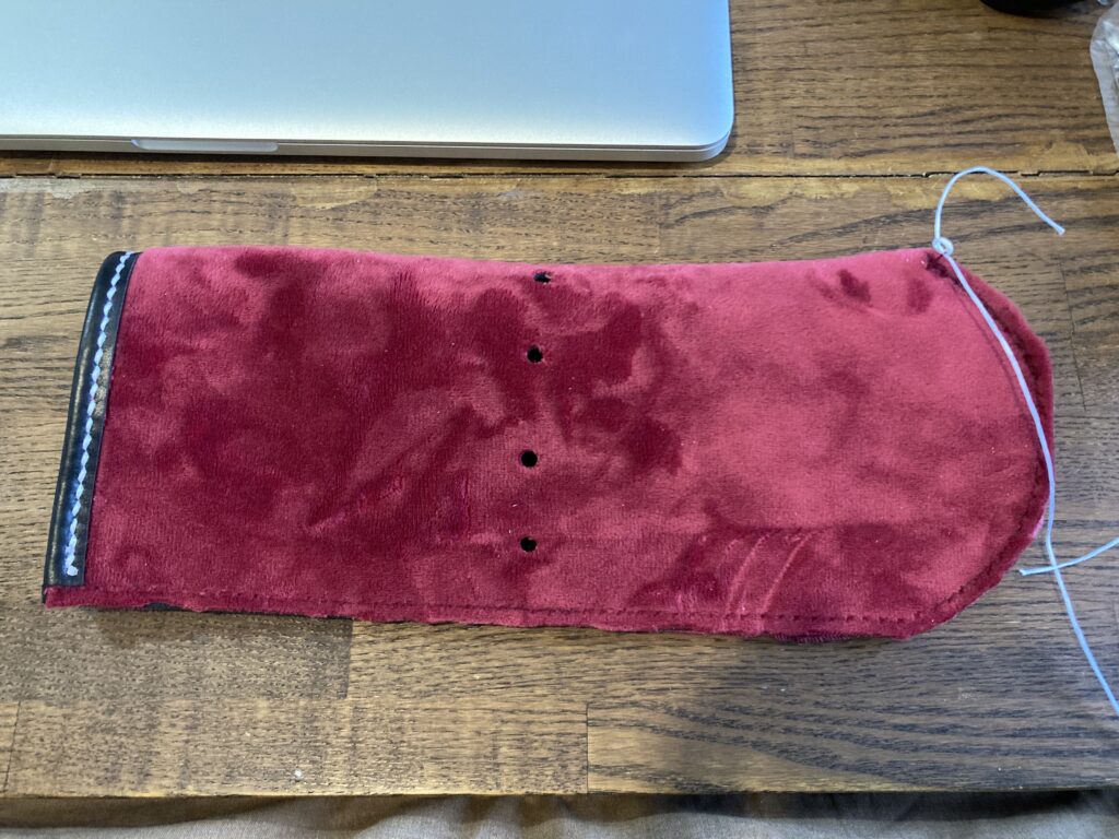 手元に白い糸しか無かったのでそれで縫っていきます。ボア布もある程度厚さがあるため縫った断面には赤いラインが出てしまいます。