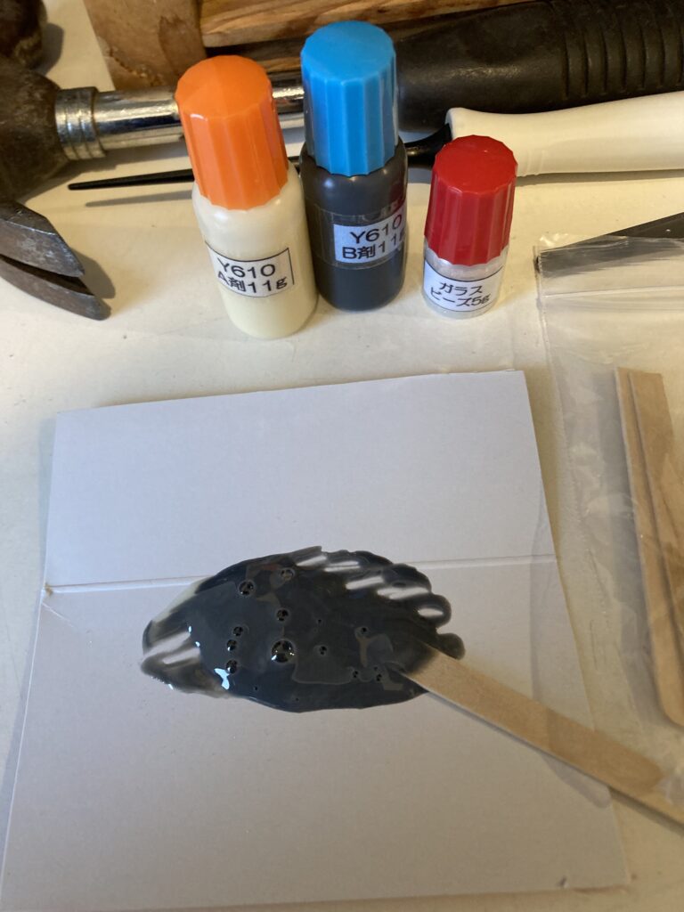 それではシャフトの先端にスリーブをつけるので、2液性の接着剤とガラスビーズを少し入れて木の棒で混ぜます。