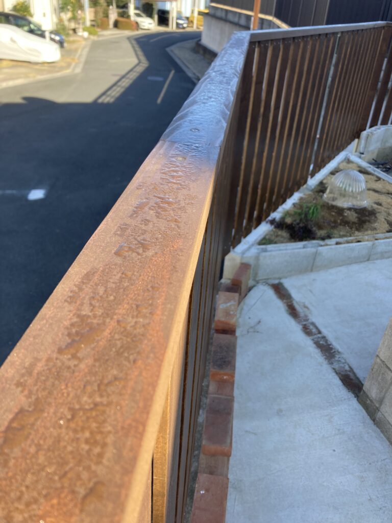 笠木も取り付けて完成しましたが、上面には朝露でびっしょりです。