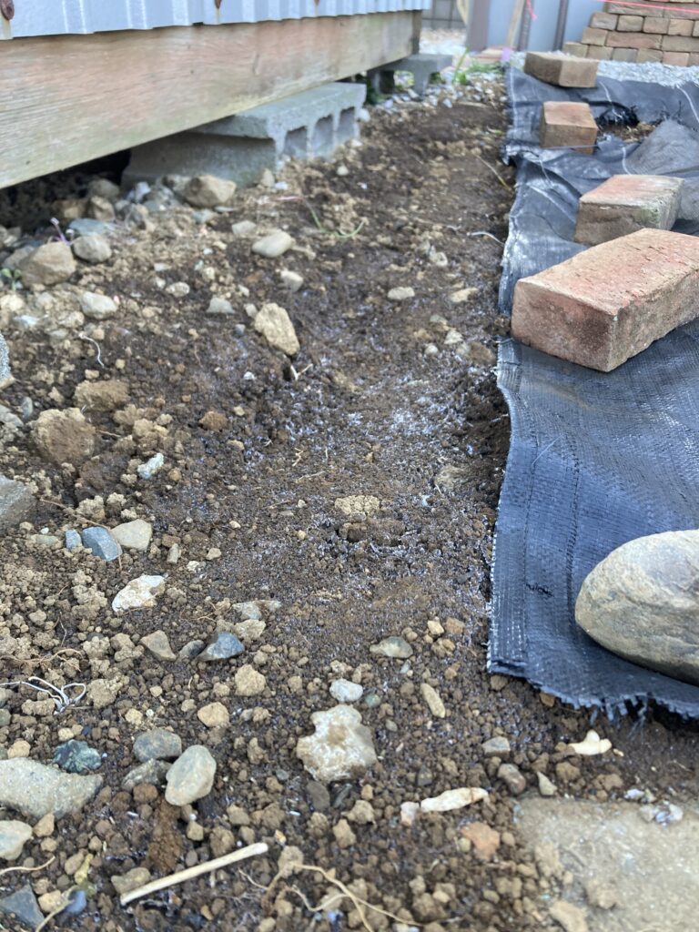 前回の作業で久々の土掘りをしましたが、土が剥き出しの部分は日光が当たる前に霜柱ができています。日陰にいるとかなり寒く感じます。