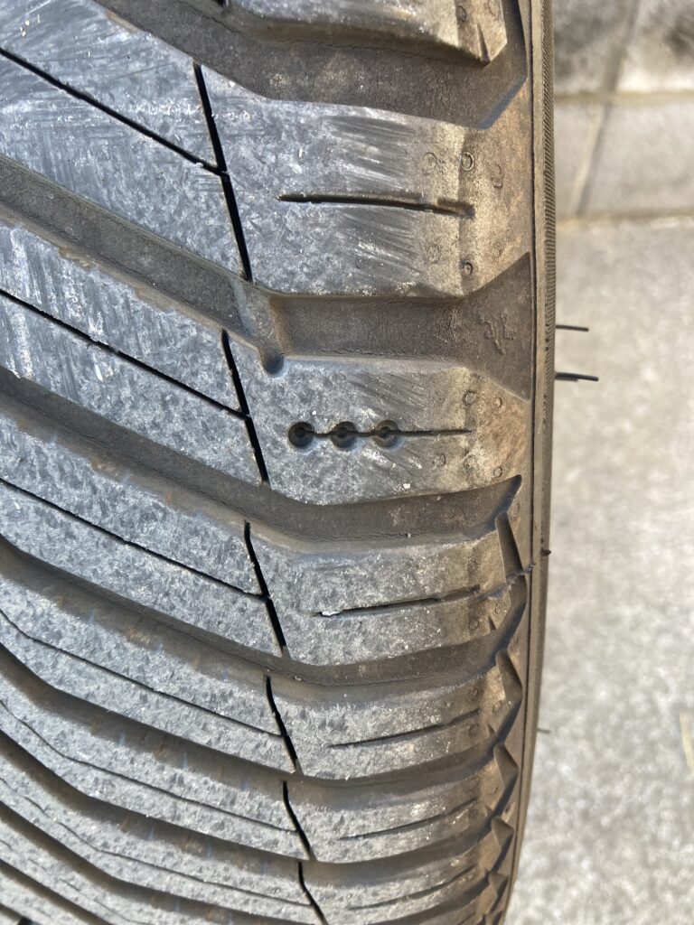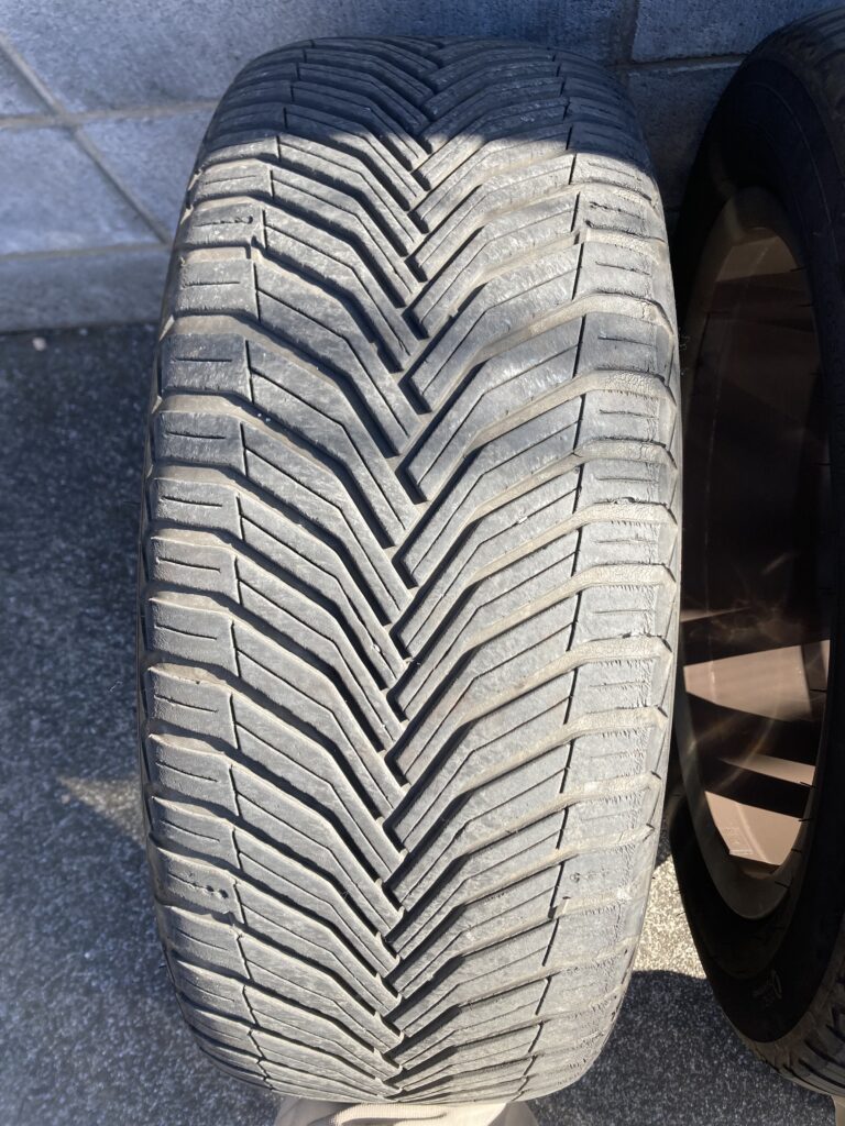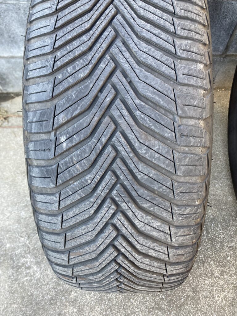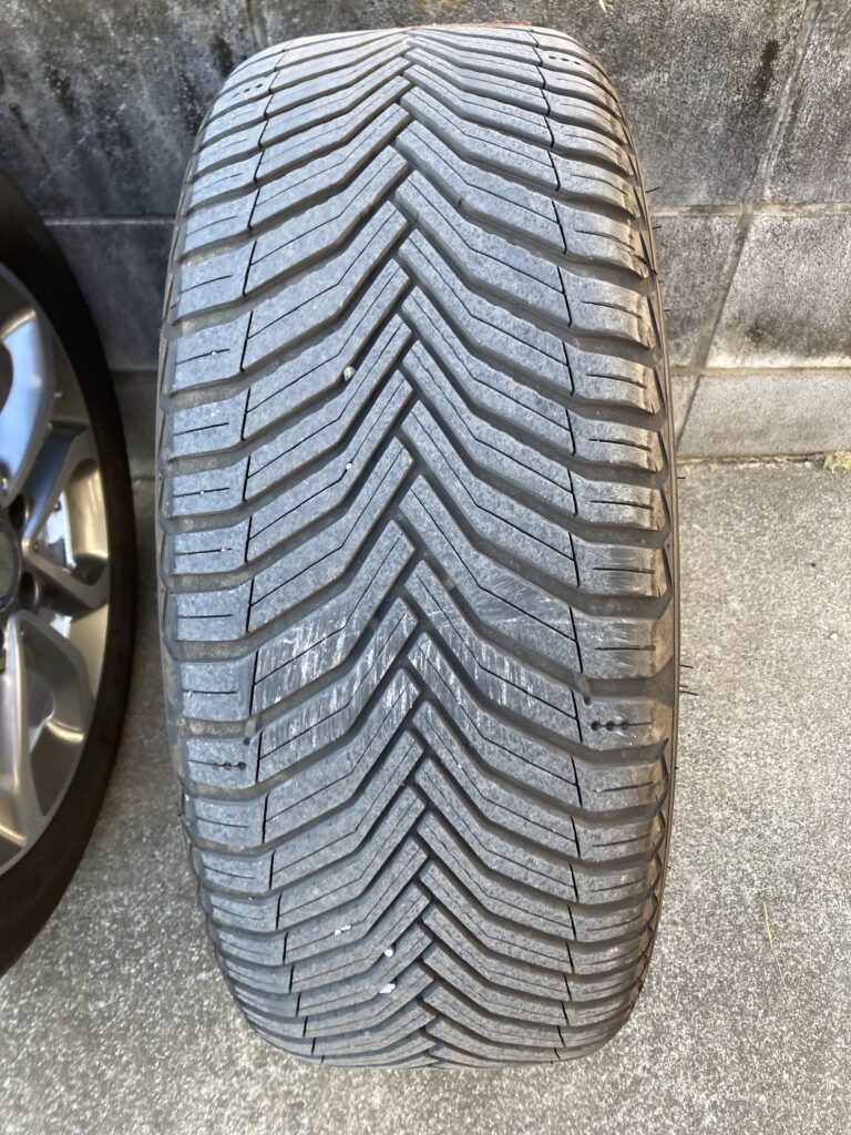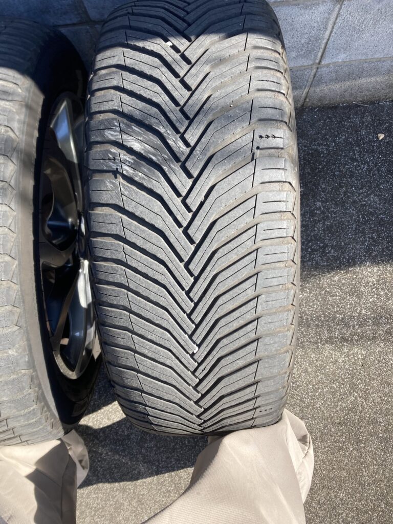 現在、車にはミシュランのCROSSCLIMATE 2というオールシーズンタイヤを履いています。昔は冬になるとスタッドレスに履き替えていましたが、雪が降っても年に2、3回でチラホラ程度あのである程度雪道も走れて耐久性も高いオールシーズンタイヤにしました。半年ほど前にディーラーで調整してもらった後で一定期間走っていましたが、これまでの経験から両前タイヤの空気が足りていないように見えるので、別のカーショップで空気圧を確認してもらうと2.1kpa(標準で2.5kpa、積載時は2.8kpaと表示があります。)しかありませんでした。空気圧が低いままで走行するとタイヤの両端の偏摩耗が起きやすいとされており、まさにそんな感じに見えます。どうなってるのさディーラーさん。耐久性について気になったのでAIに聞いたらこのタイヤは欧米では6万マイル(96000km)保証とされるほどの耐久性があるようです。まだ使えますね。