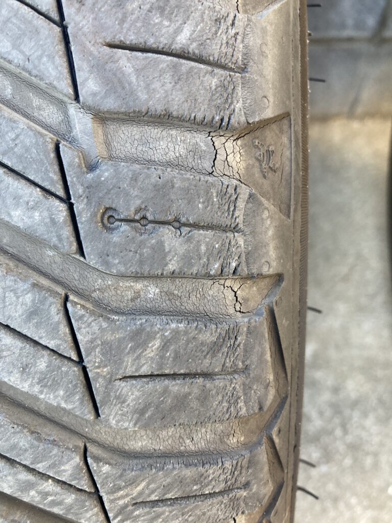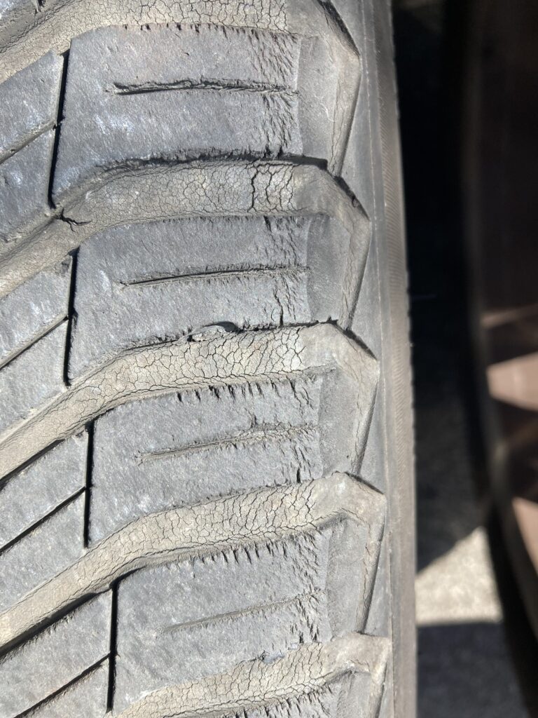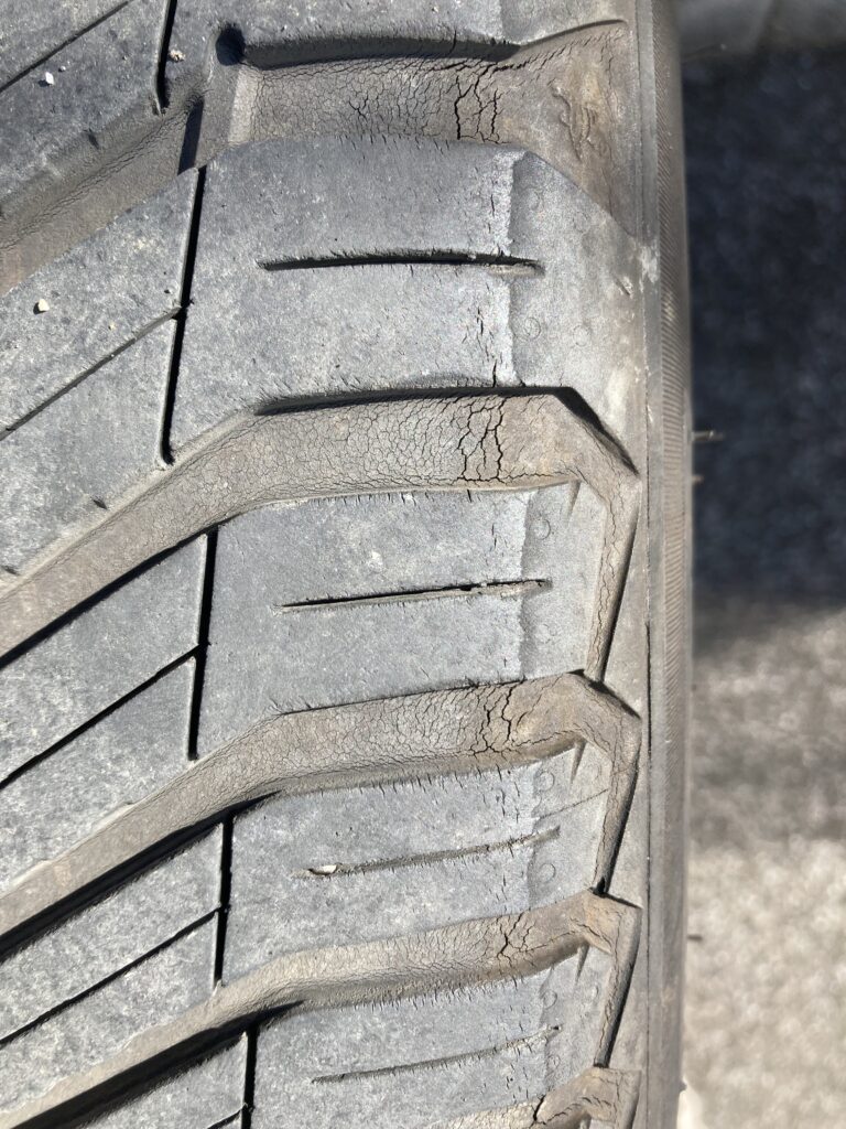 左後ろのアップ。前と後ろで劣化の具合が全然違います。回転の向きが決まっているので前後で入れ替えます。