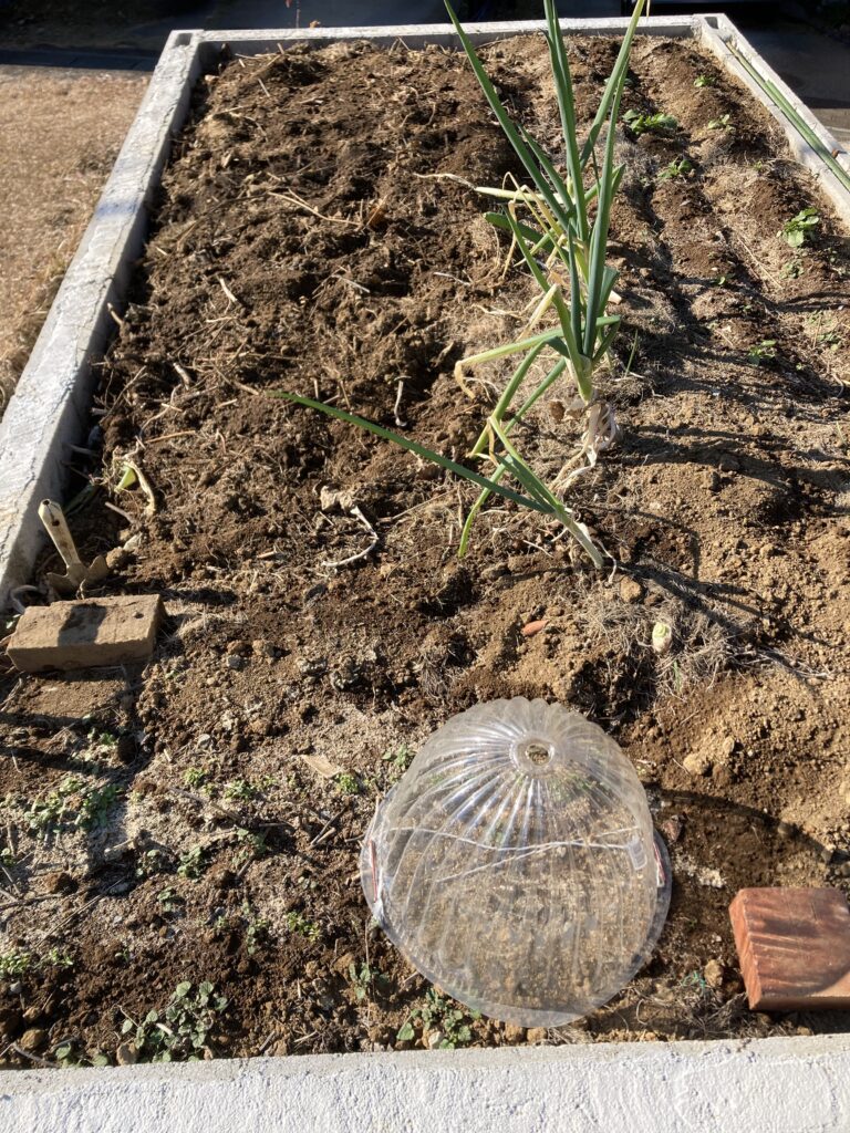 大根の芽は順調に育ち始めました。このレイズドベッドでは芽が出て育つまでに時間がかかりますね。