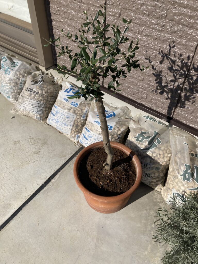 オリーブの鉢植えです。当面は南側に置いてみて様子を見ます。