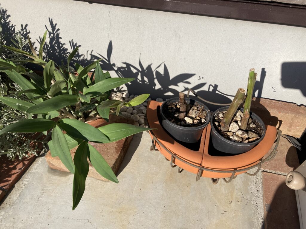 トキメキという蘭の一種の鉢植えと、イチジク、月桂樹の挿木を立ち水栓横に置いて様子を見ます。