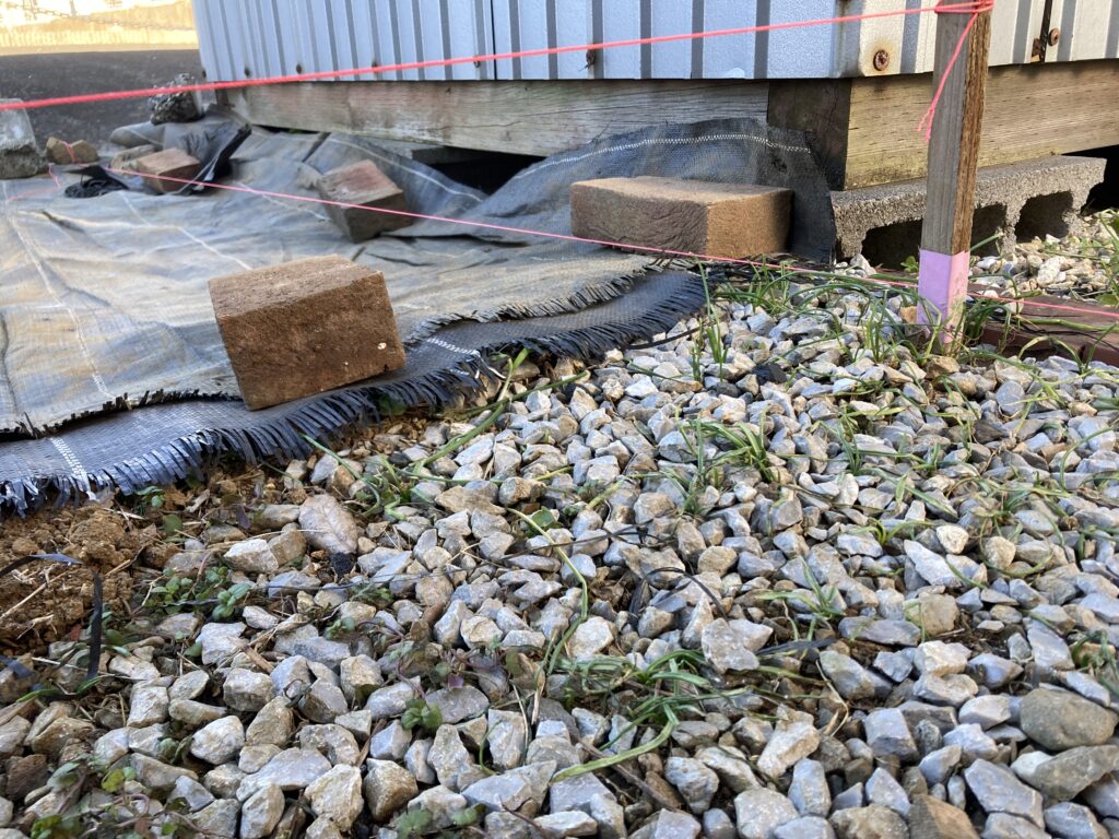 これまで家屋の周りに打設した土間コンのレベルは家屋基礎の高さを基準として来ました。同じ高さから擁壁に向かって糸を張るとこんな感じの傾斜になります。この勾配に沿って倉庫拡張エリアに土間コンを打設するかどうか悩んでいます。また、基礎に使うコンクリートブロックをどのように配置するか、倉庫本体を横移動すれば土間コンは分割すれば打設できるかなど手順を何パターンか検討しましたが、倉庫が重たくて動かないと思われ計画が破綻しています。解決策が出ないので他のことをしましょう。