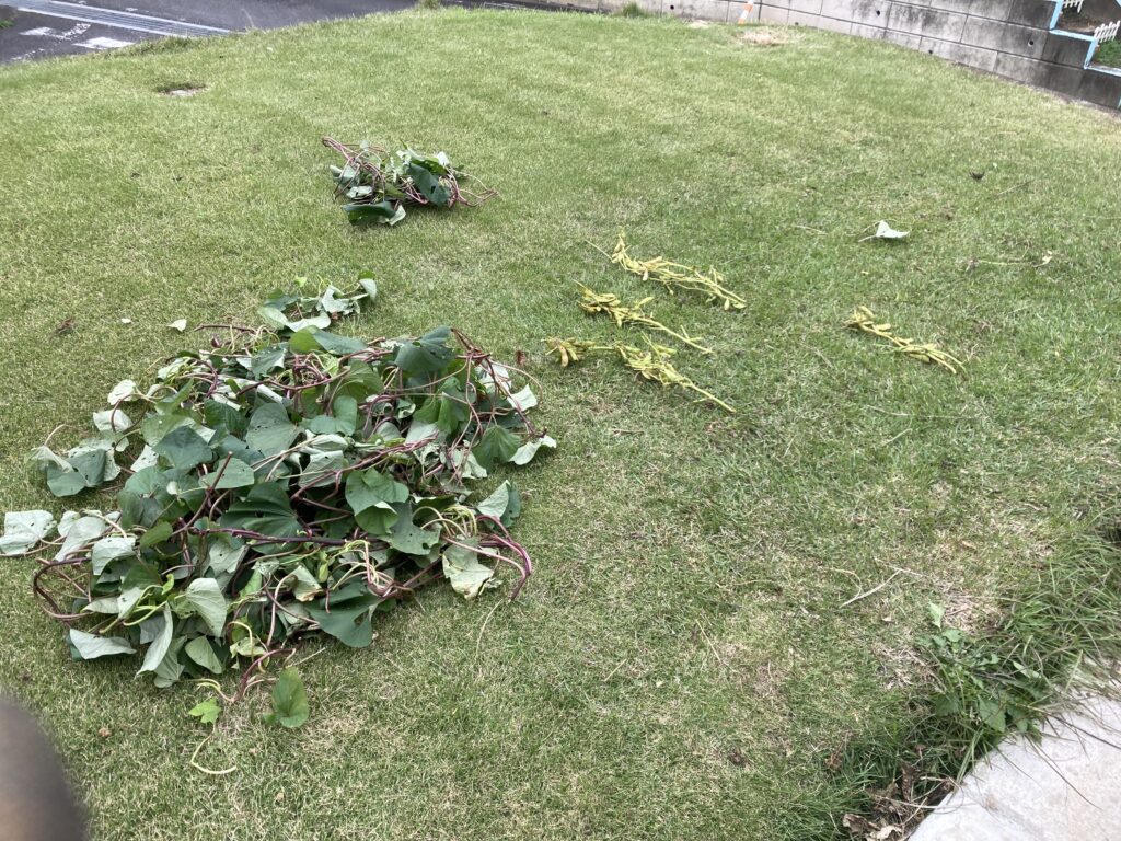 サツマイモの葉っぱと一緒にご近所にお裾分けする枝豆を配分しています。