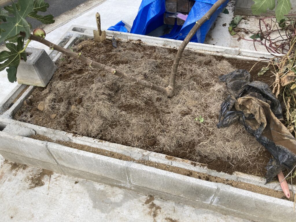 半分づつ掘って、蔓を入れて米糠を巻いてから少し土を被せる程度。