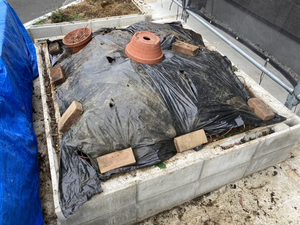 これまでに掘った時の蔓は空いたスペースに置いていましたが、レイズドベッド4にまとめて埋めようと思います。