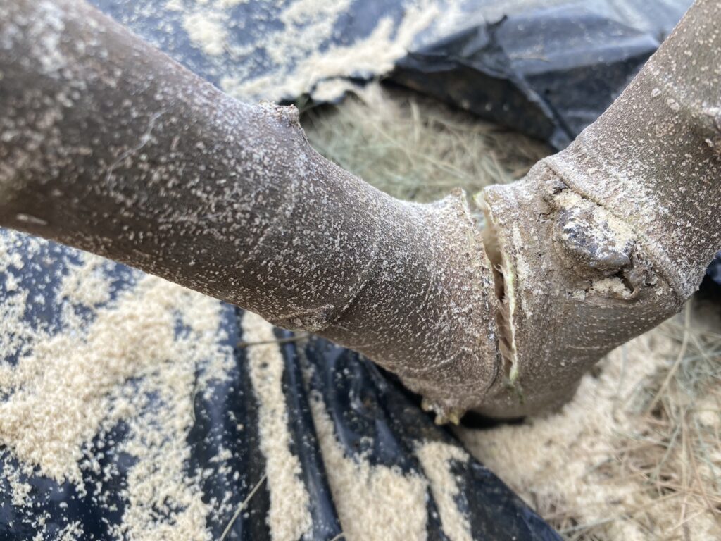 今朝も調子に乗って少し枝を下げてみたところ、「ミシッ」と嫌な音がしました。まさかね?と思いながら根元を見ると股裂状態です。これはまずいぞ、大変だ。