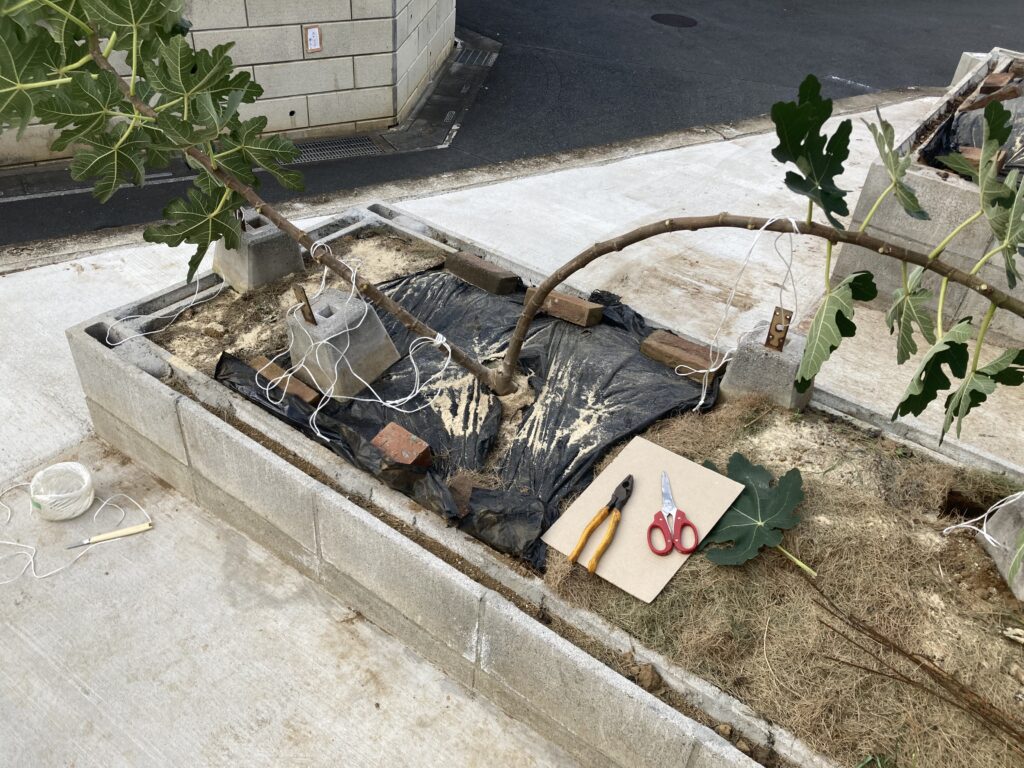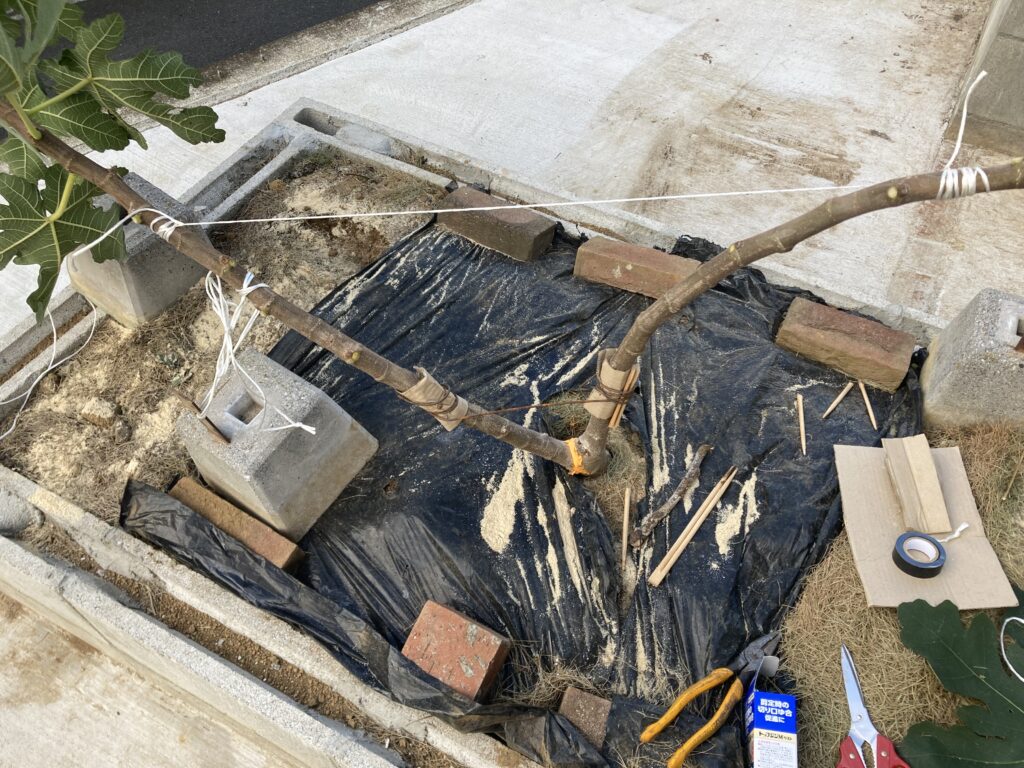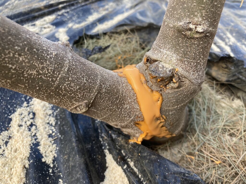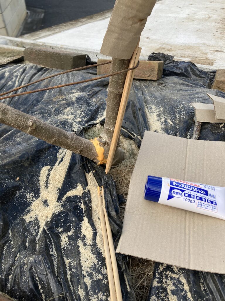 紐だけだと不安なので太い番線を幹を段ボールで保護しつつ締め付けてみます。合わせて傷口の癒合回復のため初めてですがトップジンMペーストを塗って切れ目を塞ぎました。