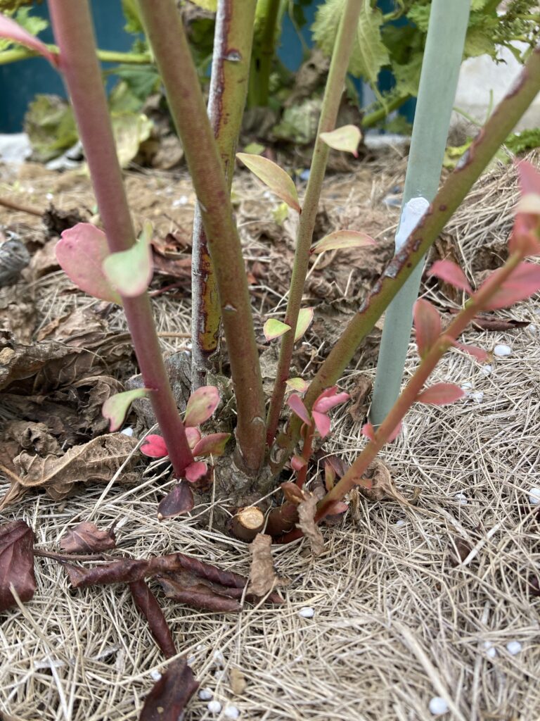 あまり変化がなかったブルーベリーですが、気温が下がってきたら根元からシュート(ひこばえ)が沢山出てきました。勢いのあるものは今後の更新で主枝としたいのですが、細いのは冬場に剪定することになります。