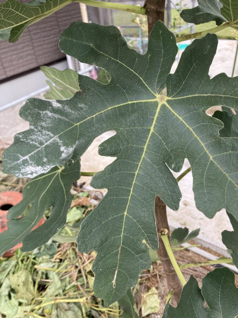 この葉っぱは枯れていませんが、白い粉状のものがついています。なんだろうこれ。