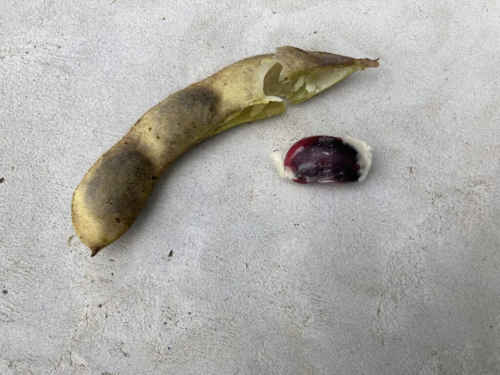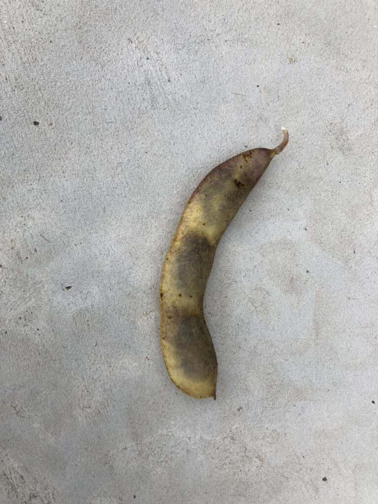 今日もご近所にお裾分けする分を収穫しました。その中で鞘が黄色っぽいものがあったのでよく見ると豆の黒さが透けています。中を見てみましょう。