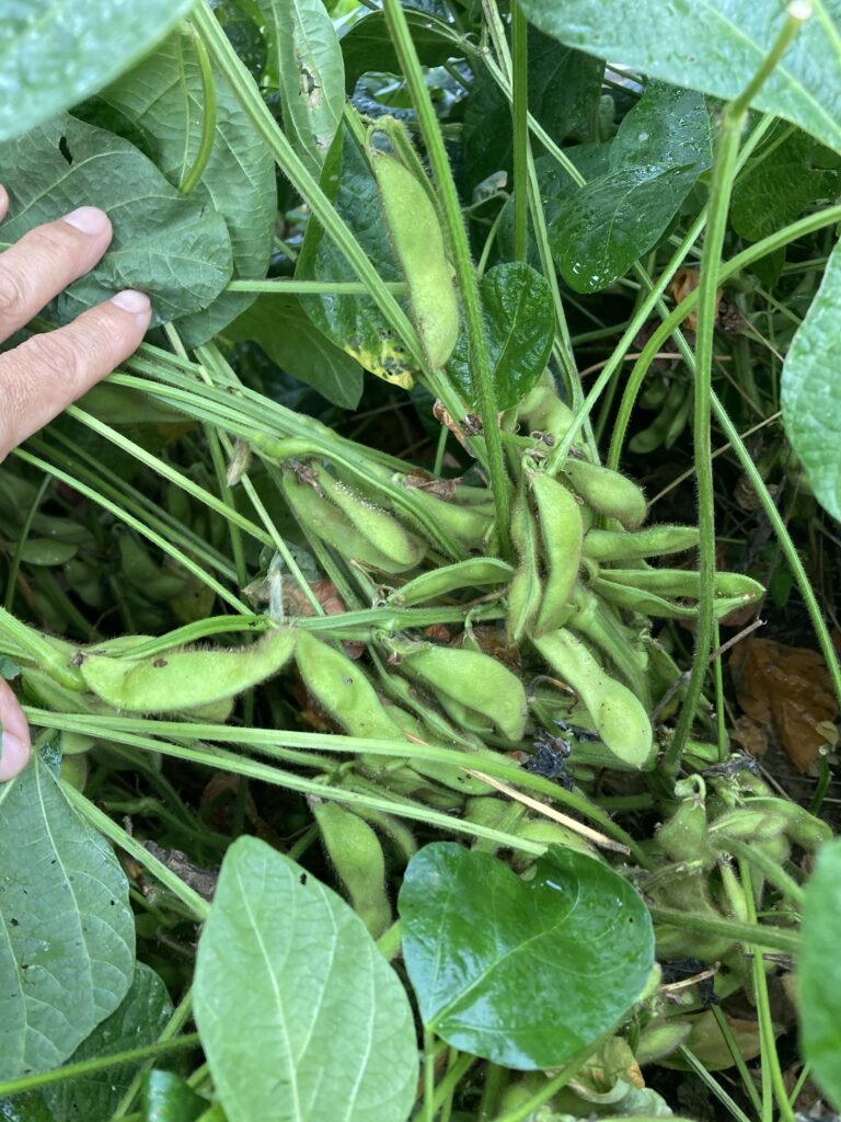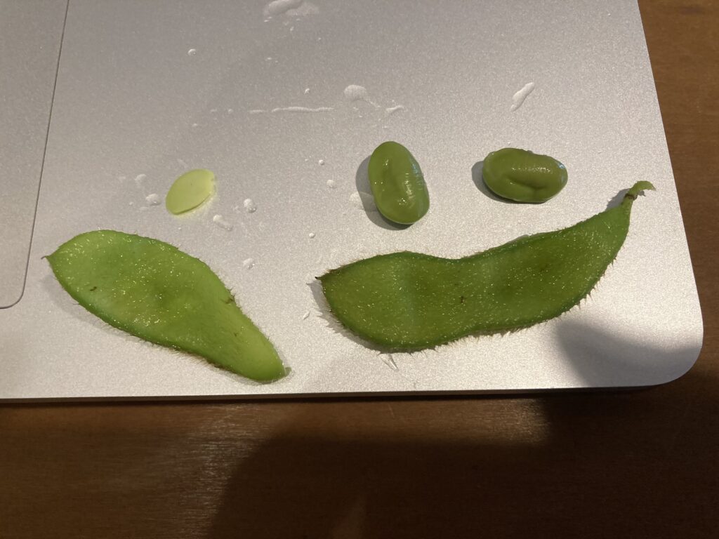 枝豆を一部収穫して茹でて試食したところ味は良いです。右が普通サイズの豆が2個入り、左は小さな豆が1個入り。左も鞘は立派なのですが実が小さ過ぎで残念です。そうは言っても鈴なりになっているので選んで食べれば良いですね。本格的な収穫は来週にします。