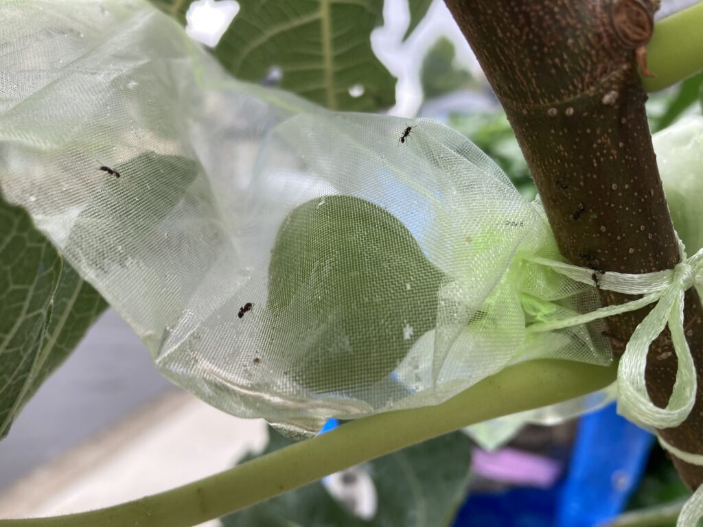 肝心の果実の方は小蟻が集っていますがネットのおかげでしっかり守られています。