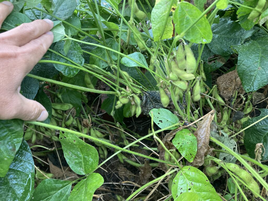 枝豆は適当に収穫して葉っぱを切り、サツマイモの葉っぱやシソの穂など合わせて、ご近所にお裾分けします。小さいカメムシが沢山いますね。