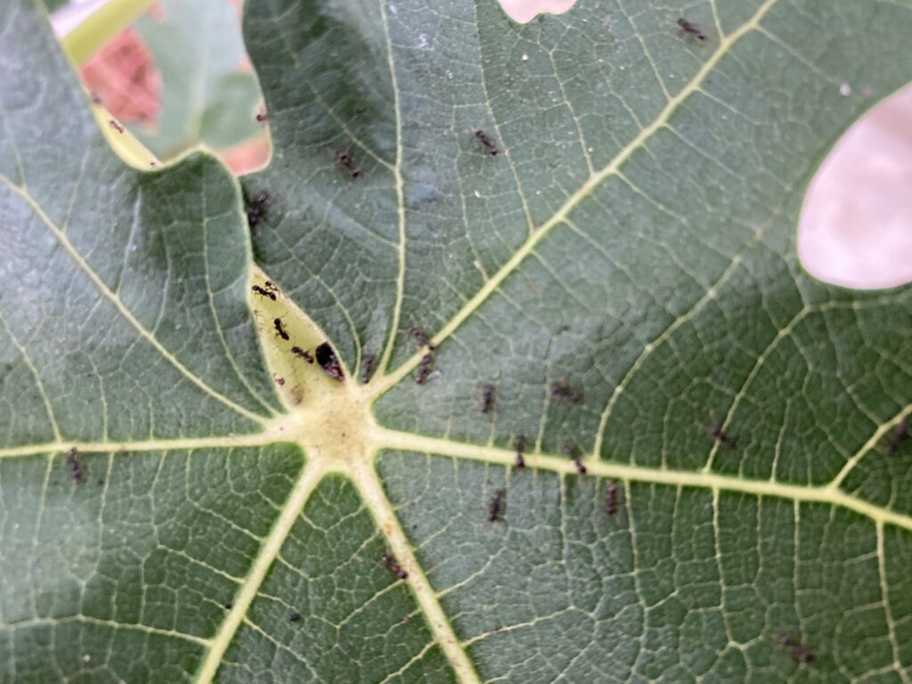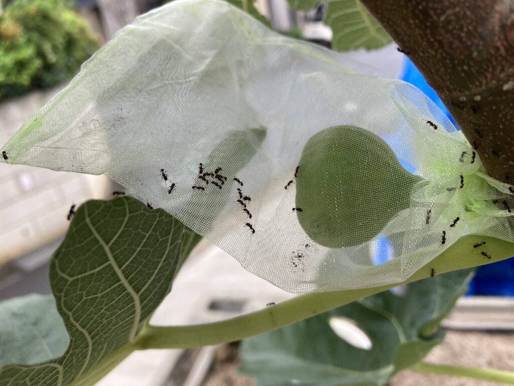 イチジクは蟻を惹きつける匂いか何かを出しているようです。実にはネットを着けている為、食害には会いませんがこの数がアタックしています。