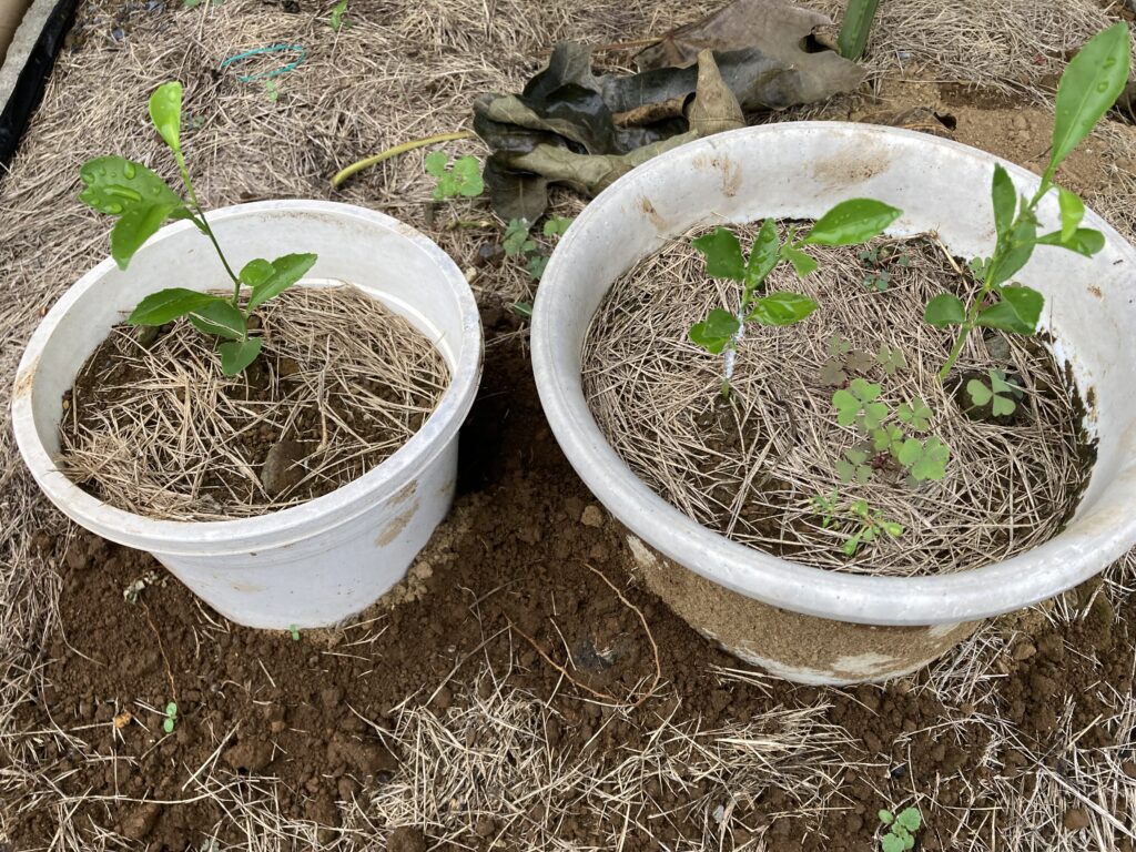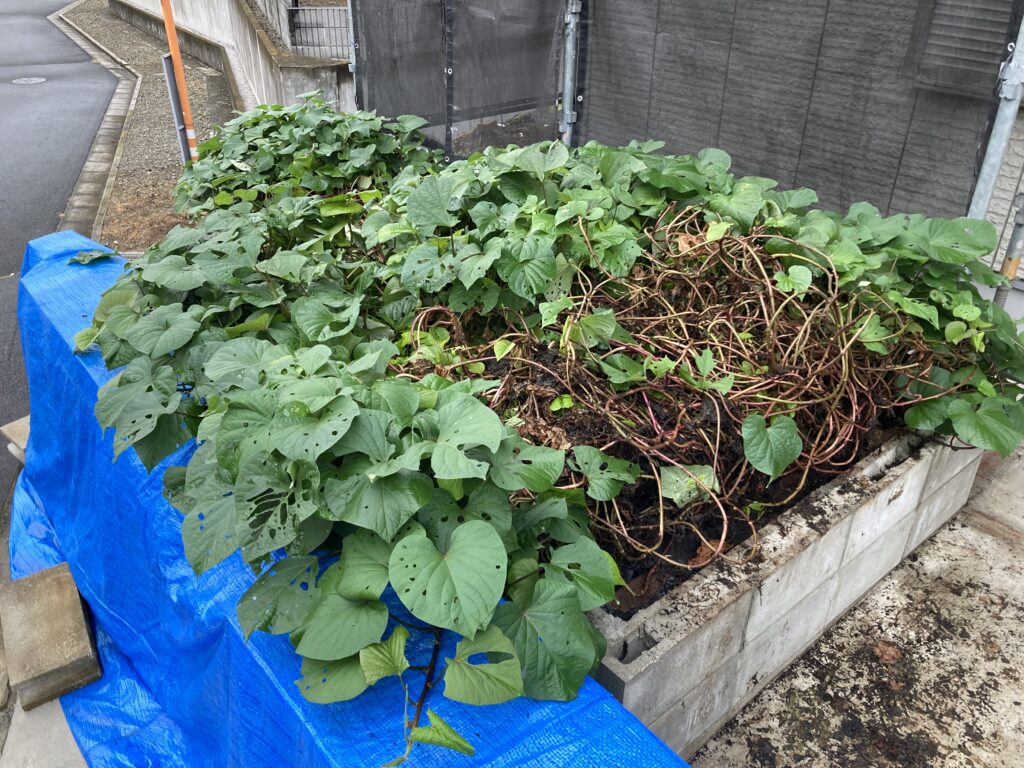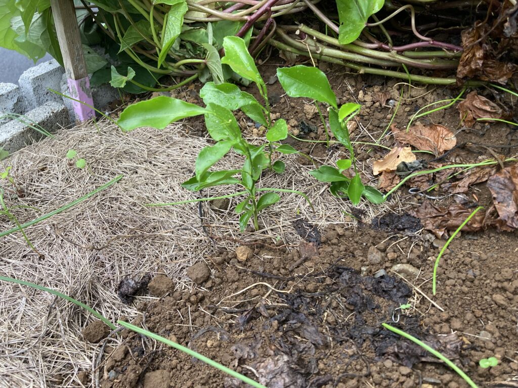 柑橘系はるかの地植え苗はサツマイモの葉っぱが被さるため、守られているのか成長を妨げられているのか。このまま冬になると寒さでやられてしまう気がします。対策を考えないといけませんね。