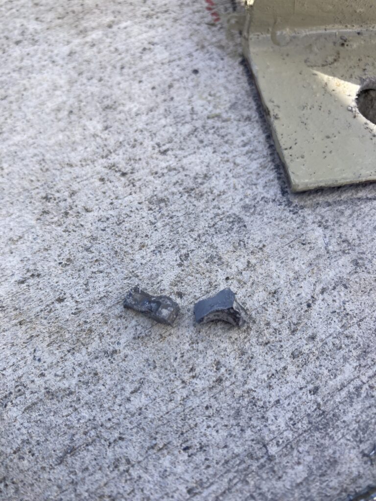 振動ドリルで少し掘ってみましたが、なんだか感触が変です。ここでお隣さんから今朝もらった曲がるストローの登場です。片側を穴に入れてフッと拭くと穴の中の埃が吹き飛んで仲が見えます。穴を覗くと金属らしいものが光っています。金属ならと金属用の刃に変えてドリルで掘ってみると少し掘れて、細い道具で突いたら動いたので取り出して見ると先日のコンクリートドリルの刃の先に付いている超硬の金属部分です。なんだかなあと思いながら、振動ドリルに変えて掘るとあっさり掘れて、薄い土間コンは貫通してしまいました。