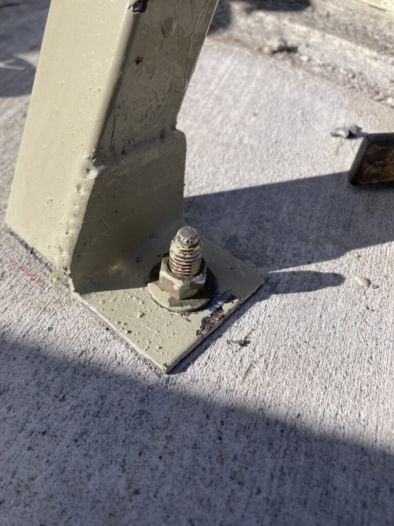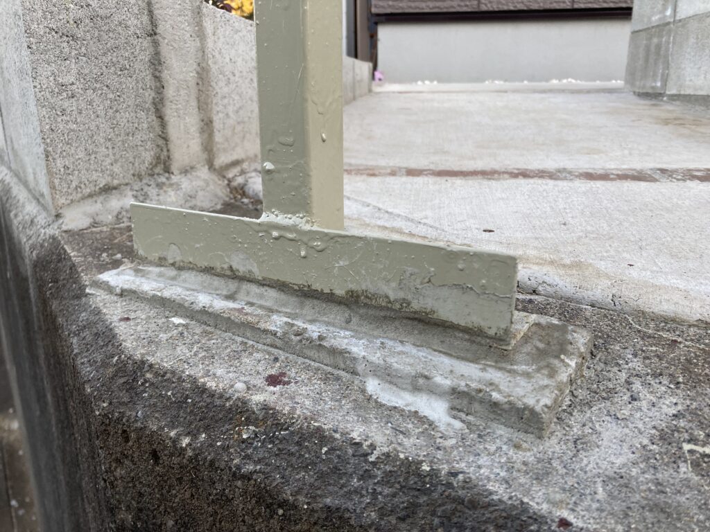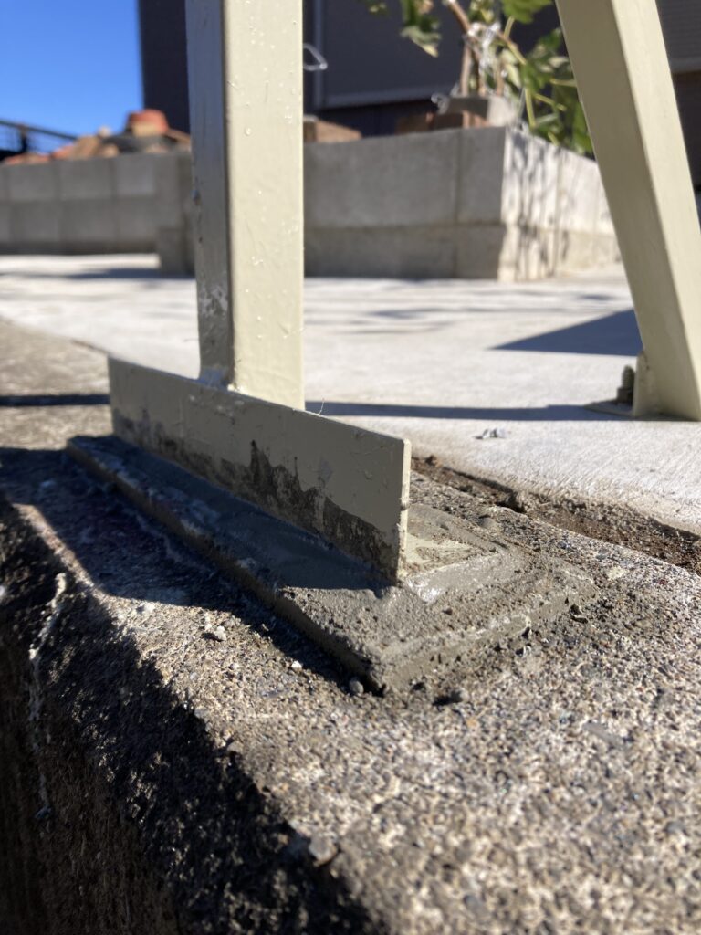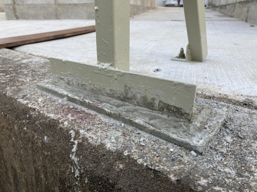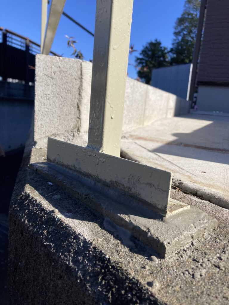 先に水撒きだけして湿り気を与えておきました。ここは1番の柱です。ベースプレートの下に隙間があるのでなんとか奥まで押し込む感じで無収縮モルタルを入れていきます。