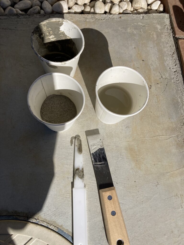 無収縮モルタルなんて初めて使いますが、石膏のような成分が入っているようで速乾性があるようです。1.3kgと半端な量ですが2㎜程度の隙間なのでコップ1杯くらいで足りると思います。コーキングのヘラをメインに使って混ぜました。ほんの数分したら少し粘度が上がってくる感じです。