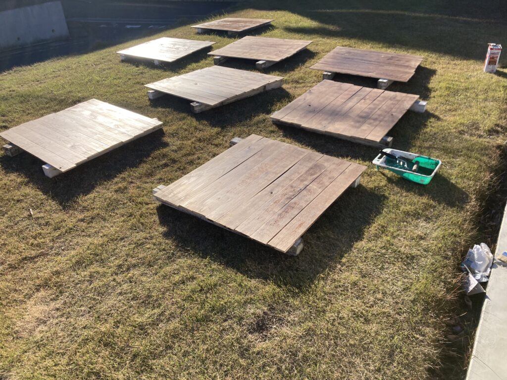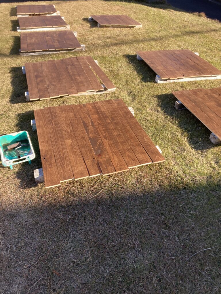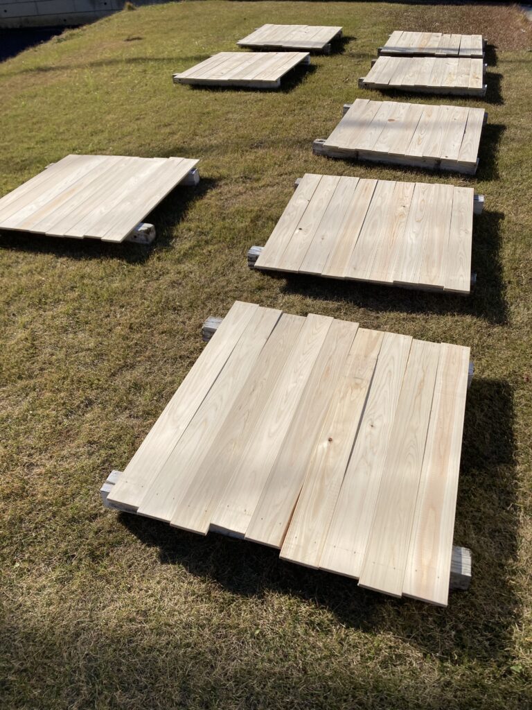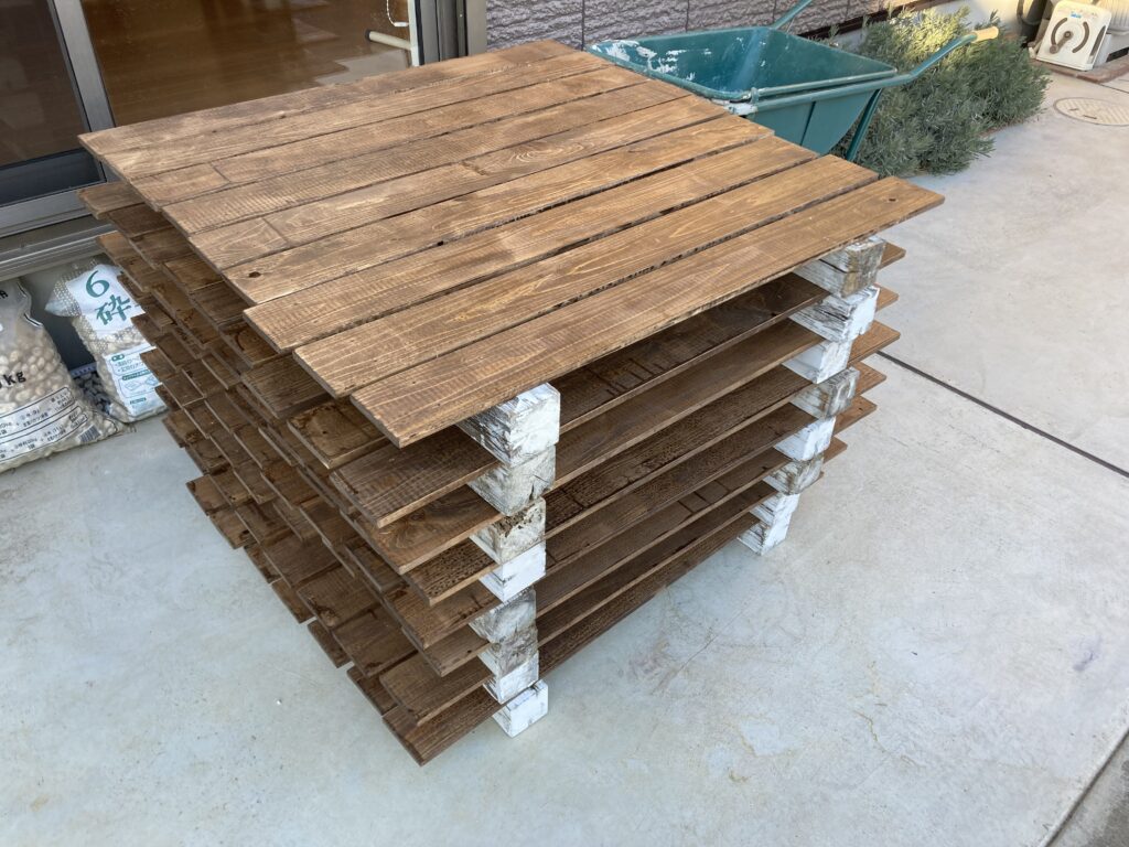 先日Amazonで買った油性の浸透する塗料を塗っていきますが、段取りが大事なので角材を2本敷いて9枚づつ乗せています。最初に面を揃えて、樹皮(外側)の面から塗っていきます。