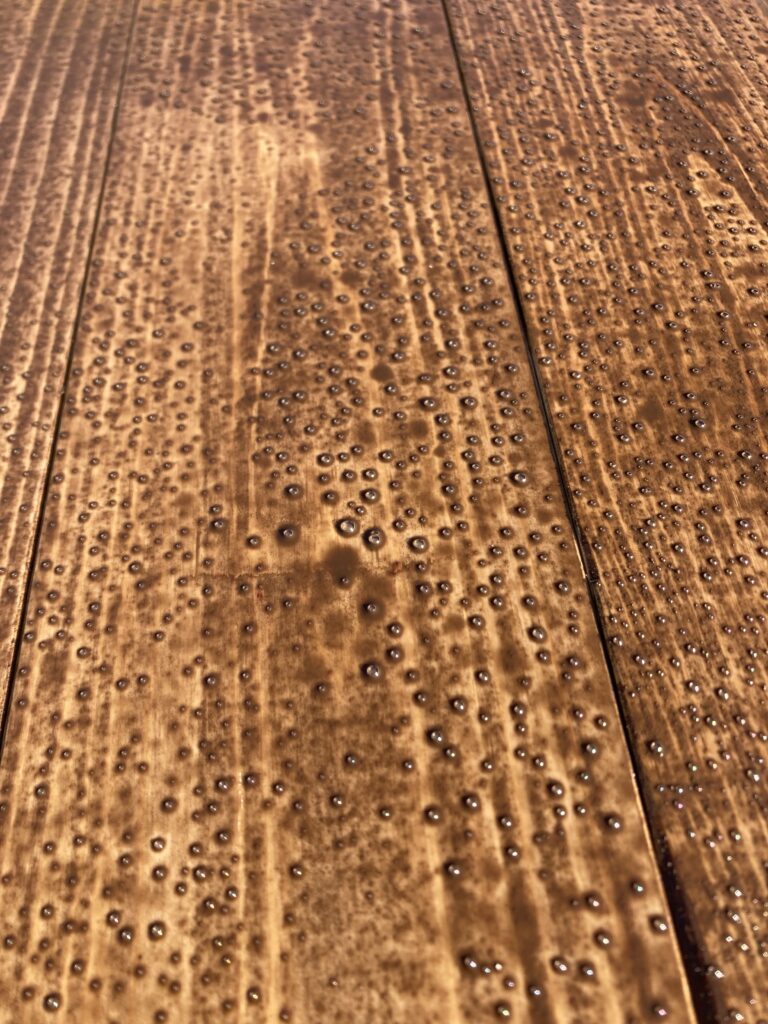 切断した小口と側面を塗り終えましたが乾燥まで時間が掛かりそうです。夜露も心配なので土間コンの上に取り込んで角材を挟んで乾燥させましょう。明日、2回目の塗装をして塗装は終了にします。