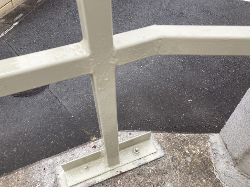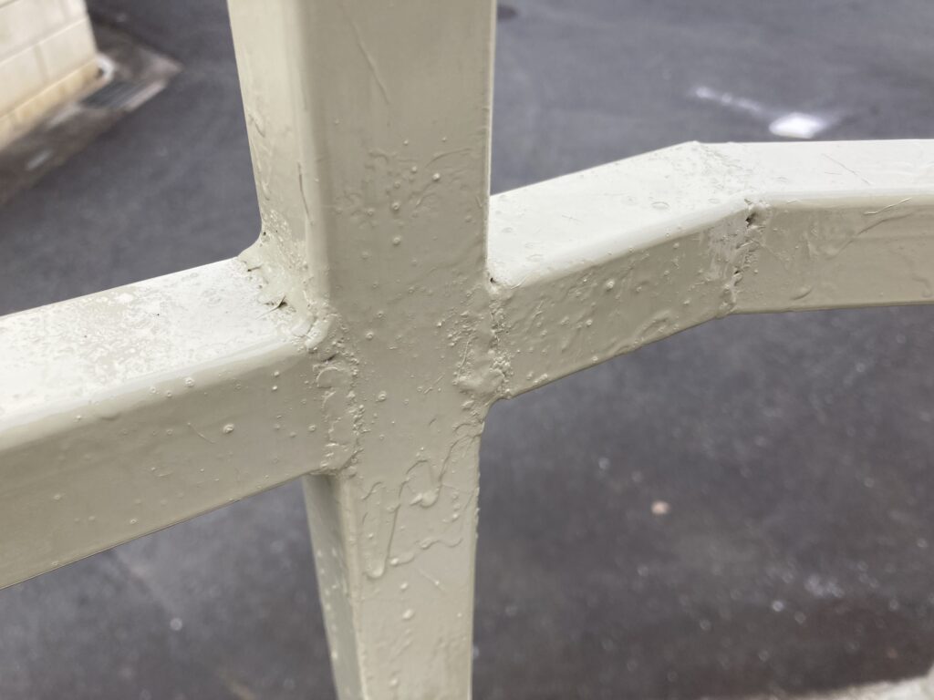前回のペンキ塗りでガタガタの溶接後も大方埋まっていますが、部分的に穴がありますので溶接部中心にペンキの上塗りをしましょう。ここは4番の柱と下部材の溶接部です。