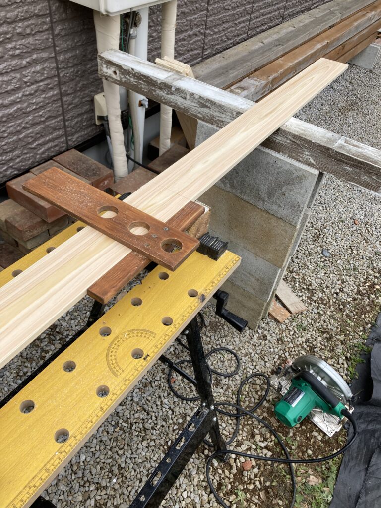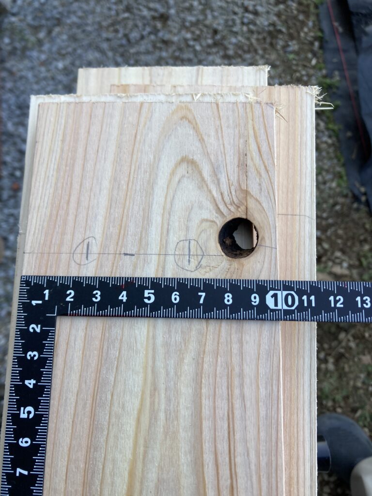 カットする部分には下に木材を敷いていますがそれでもバリが出ますね。数本まとめた方が綺麗に切れたかもしれません。この鉛筆の線はビスの下穴用の目印を付けていますが、ちょうど節穴が来る場所は少し移動して印を付けます。