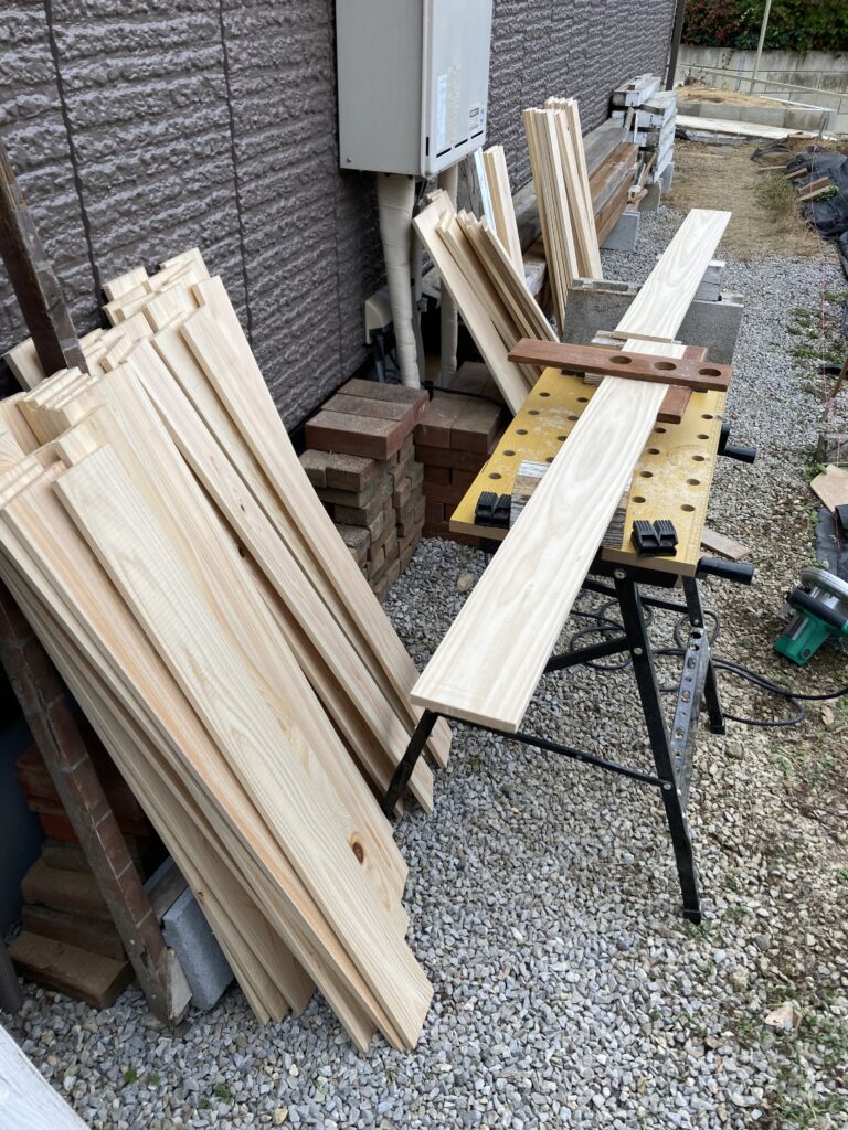 下穴を開けたら、切断面を電動サンダーで削って整えました。まさに修行のような感じでした。そろそろ雨が降りそうなので倉庫内に片付けます。明日晴れたら塗料を2度塗りする予定です。