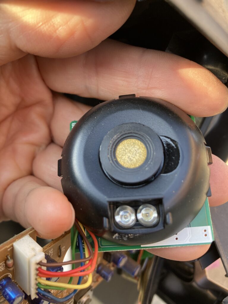 数年前から存在を忘れていましたが、押しても何も反応がないので中がどうなっているのか確認することにしました。開け方もネットに有ったのでその手順で開いたところスピーカーにかかっている黒いビニールが破けており、まずはこれが鳴らない原因。また、その上にあるのがモニターのレンズになるのですがレンズ面が黄色い粒でガサガサです。レンズと言えば透き通った球面だと思うのですが、???なんだこれ。
