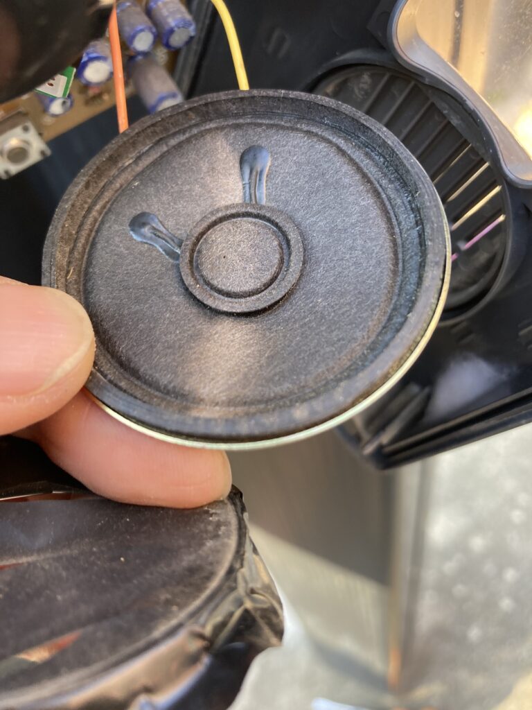 こちらはビニールのカバーが破けていたスピーカー。50㎜くらいですがスペック表記がありません。いくつかDIYの記事を見るとスピーカーの交換で復活した方がいるようです。Amazonで見る限り今のスピーカーは28㎜が主流のようです。我が家ではモニターや映像も必要ないのでチャイムみたいなものに交換するか検討を始めることにしました。