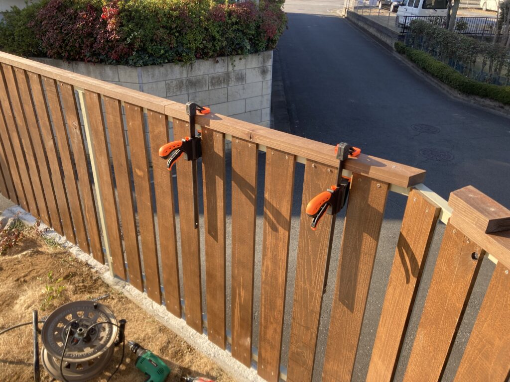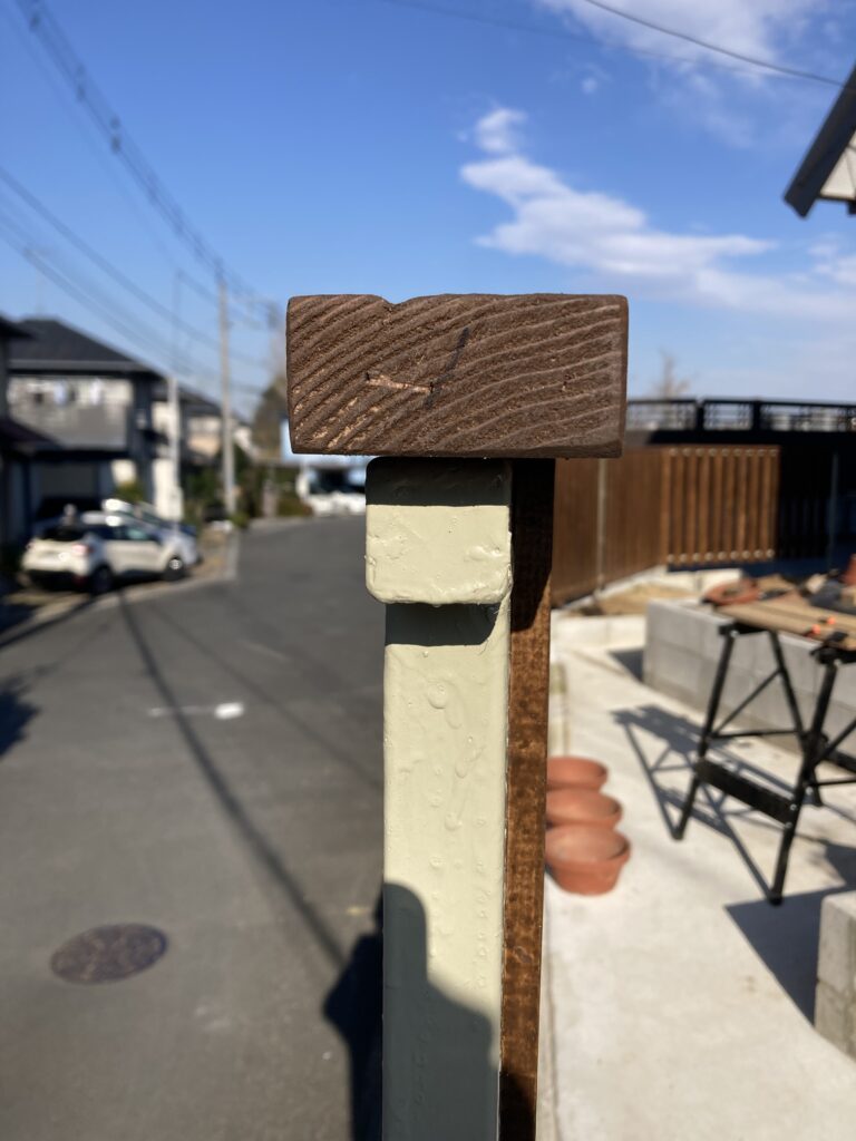 予定の位置に笠木を仮置きし、笠木の下穴を開けるため寸法を測って印をつけました。