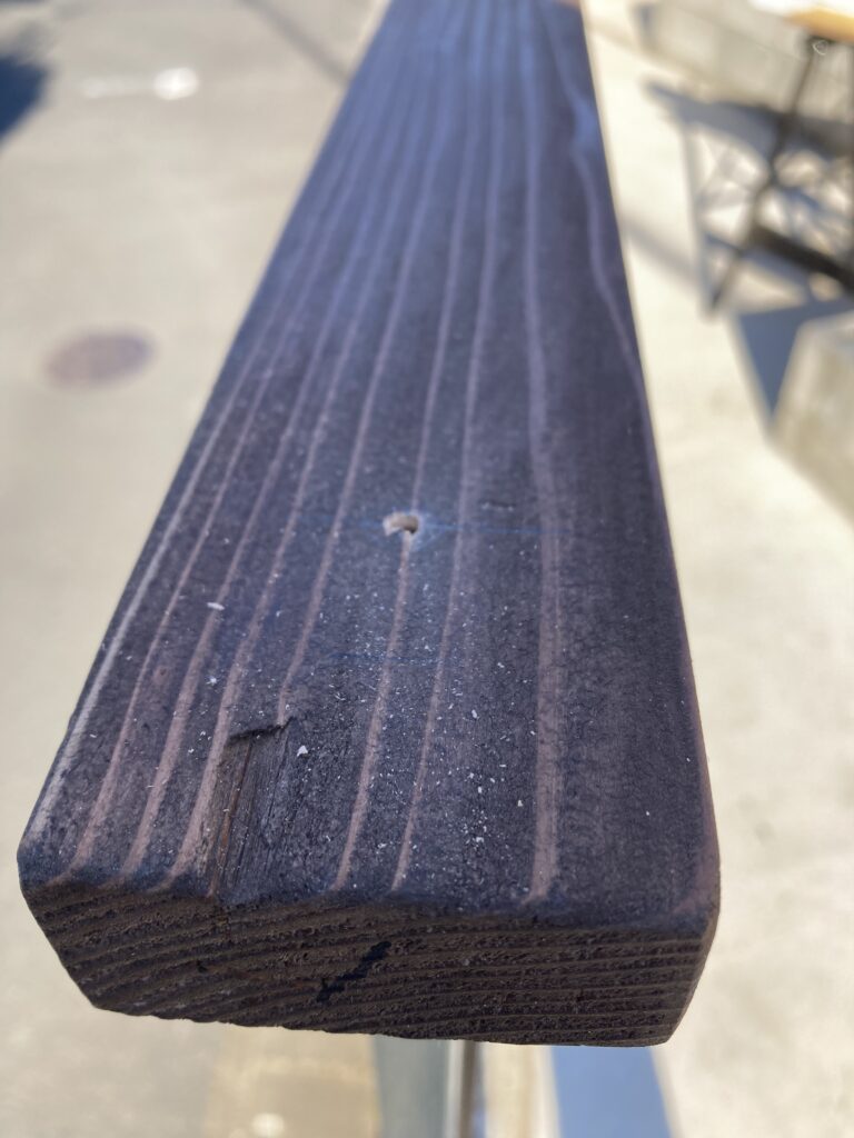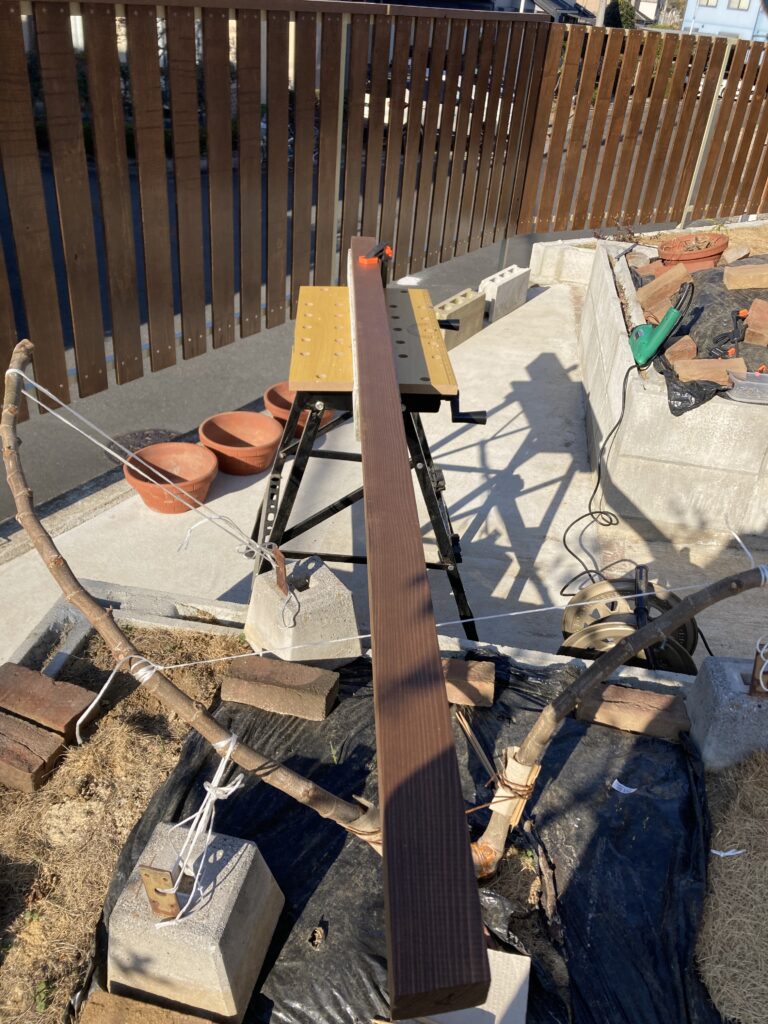 文字で書いても伝わりにくかったかもしれませんが、笠木を角パイプと板材の上に仮に置いて横から見るとこうなります。笠木は杉の木で、上側に外皮側としており、反りが出た場合は中央が高くなり水勾配ができますのでかえって良いかも。上からの雨は笠木で受けるので、角パイプも板材も痛みが減るはずです。