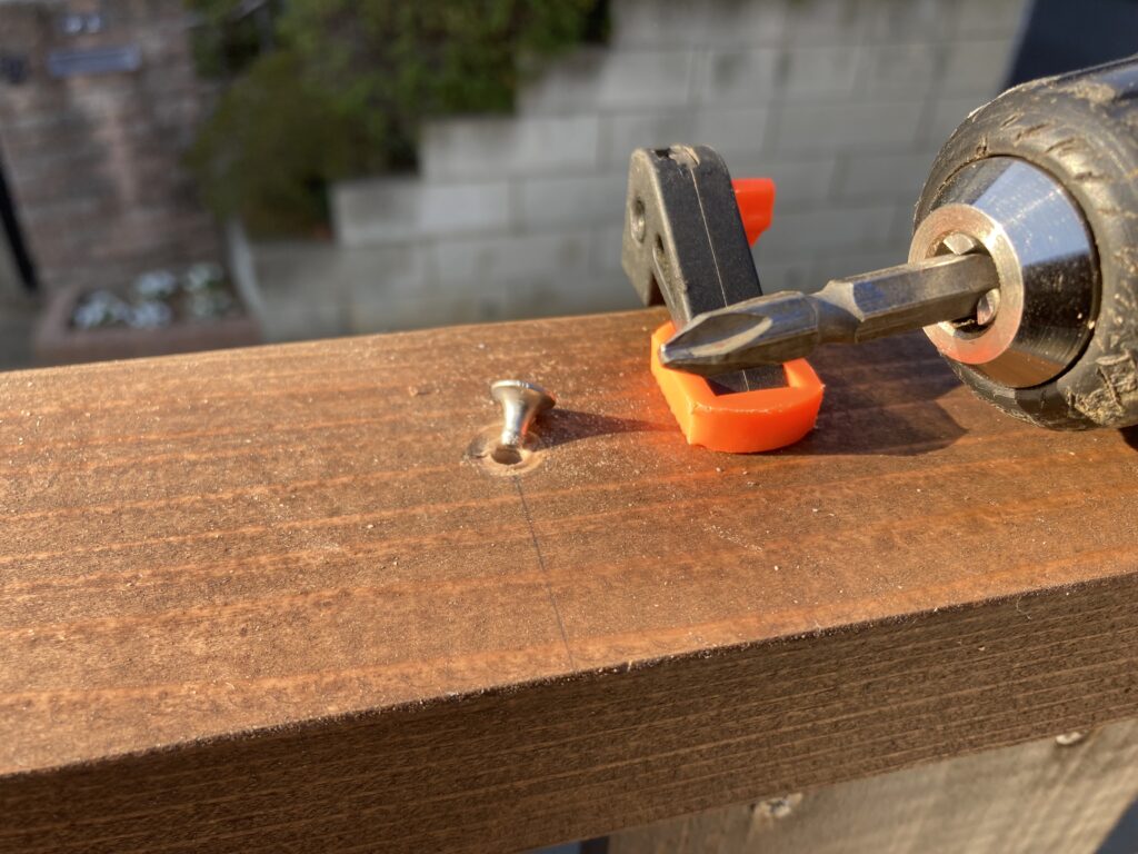 下穴を開けたら、ステンレスのコースレッドをねじ込んでいきます。41㎜のビスしか無かったので、角パイプには10㎜くらいしか効きません。実験したらしっかり固定できているのでこれで進めます。