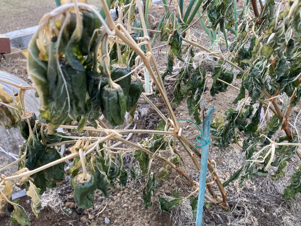 ピーマンは氷点下の朝を2回くらって枯れてしまいました。根っこを室内保管して来年植えることも考えていたのですが、ピーマンならタネから巻いても変わらなそうなので明日引っこ抜きましょう。