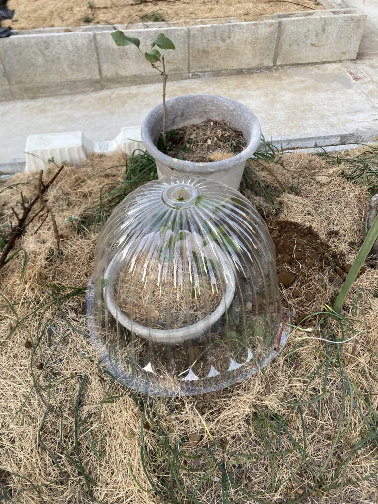 こちらは植木鉢の柑橘系はるかの苗です。これもカバーして様子見ます。