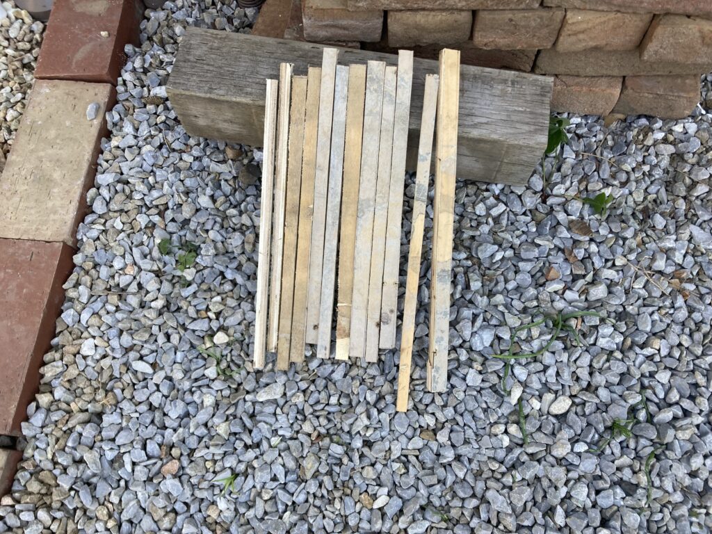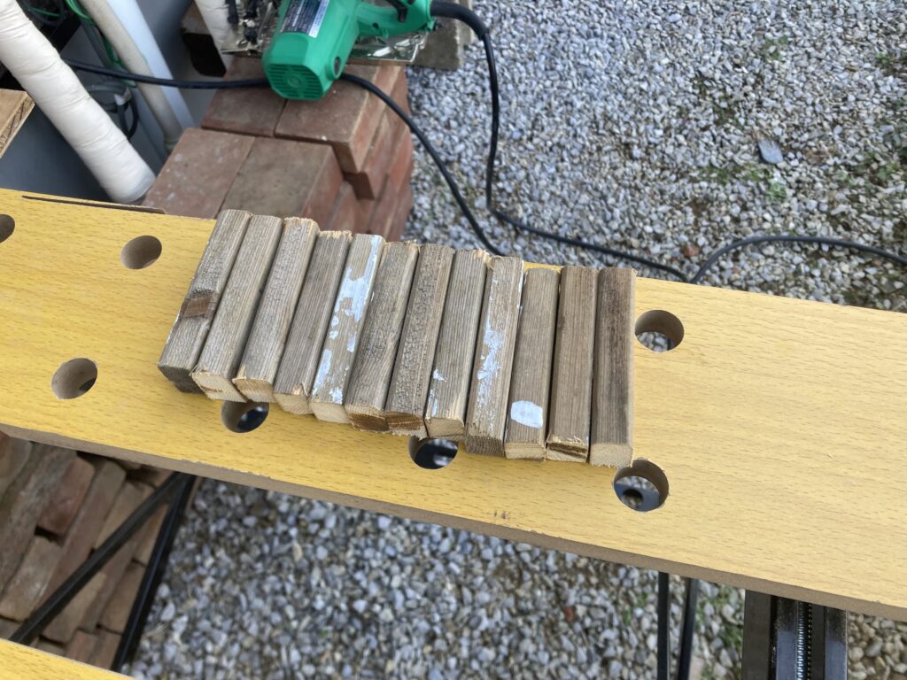 こちらは長手の材料を加工しました。手動の丸鋸しかないので15㎜で300㎜程度の細長いものを切っていくと少し曲がっただけで寸法が結構変わってしまします。スライド式など欲しくなる瞬間です。
