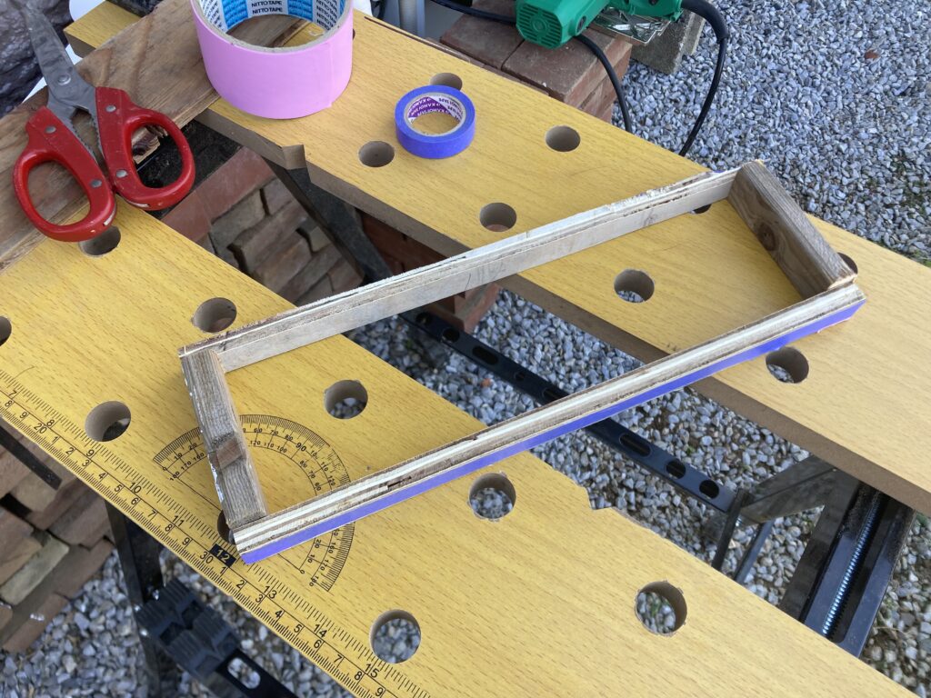 型枠作成にはビス止めを考えていましたが、絶対に木が割れるしそれほど力が掛からないと思うのでガムテープで仮固定してからマスキングテープで周囲を1周させて固定しました。持つだけで歪みますが、今回は歪んだ方が擁壁上面の不揃いな傾斜にフィットしてくれると思います。