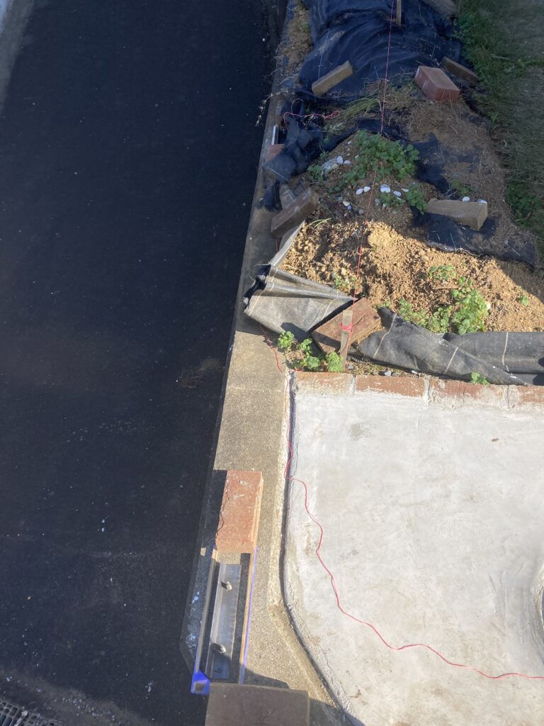 さらに3時間後の写真です。表面は少しざらつきましたが水も良い感じに引いて乾燥が始まっています。モルタルは水が出た後に一回触った方が仕上がりが良くなるんでしょうね。土間コンでもそうでしたね。