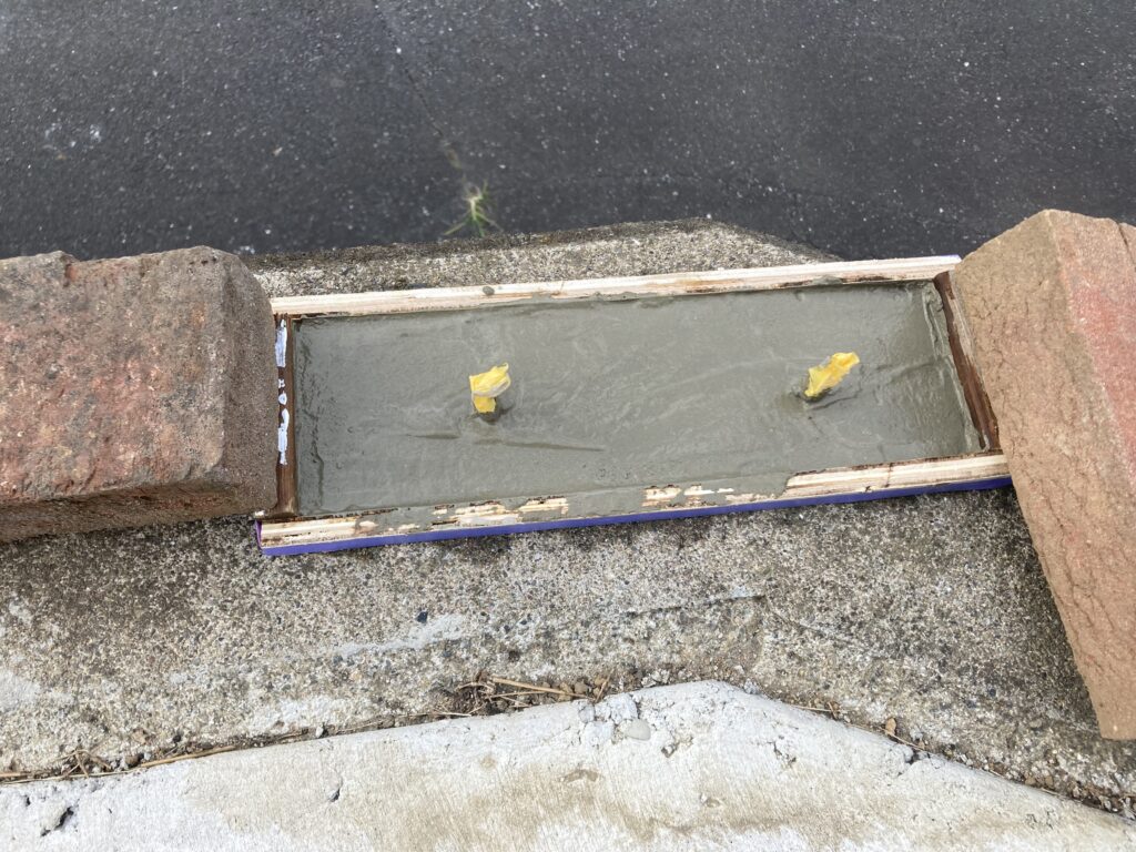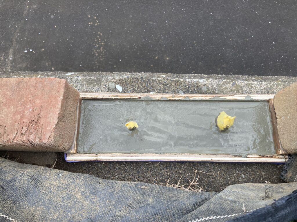 セメントと砂を1:1でかなり緩めに混ぜたモルタルを入れていきます。本当は型枠の高さで決めたかったのですがノコギリでガタガタなので型枠の厚さ(高さ)は大体の感です。ここが1番。
