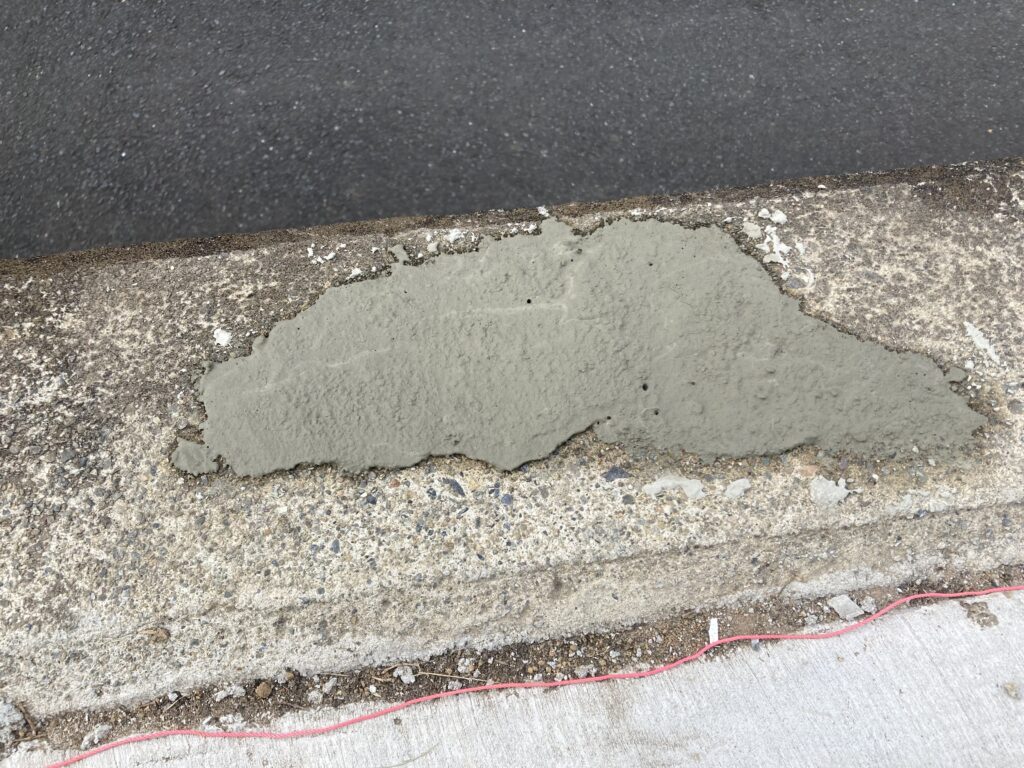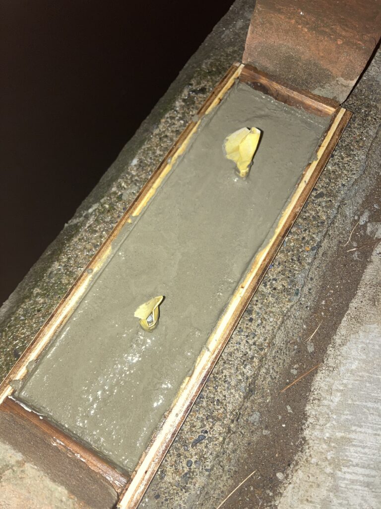 小さなコテを使って表面のパリパリを割って6箇所全部を馴染ませる感じにならしてみました。コンクリートは余りいじると良い事がないので、あとは数日間、硬化するのを待つことにします。